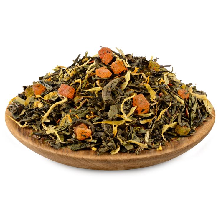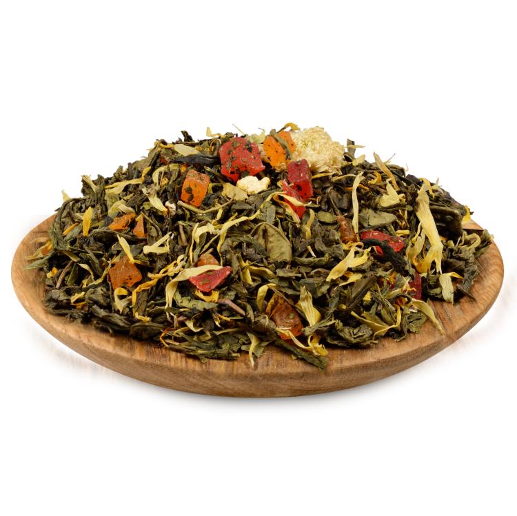 Состав: Сенча, ганпаудер, папайя, цедра апельсина, цветы хризантемы, лепестки календулы, ароматизатор.