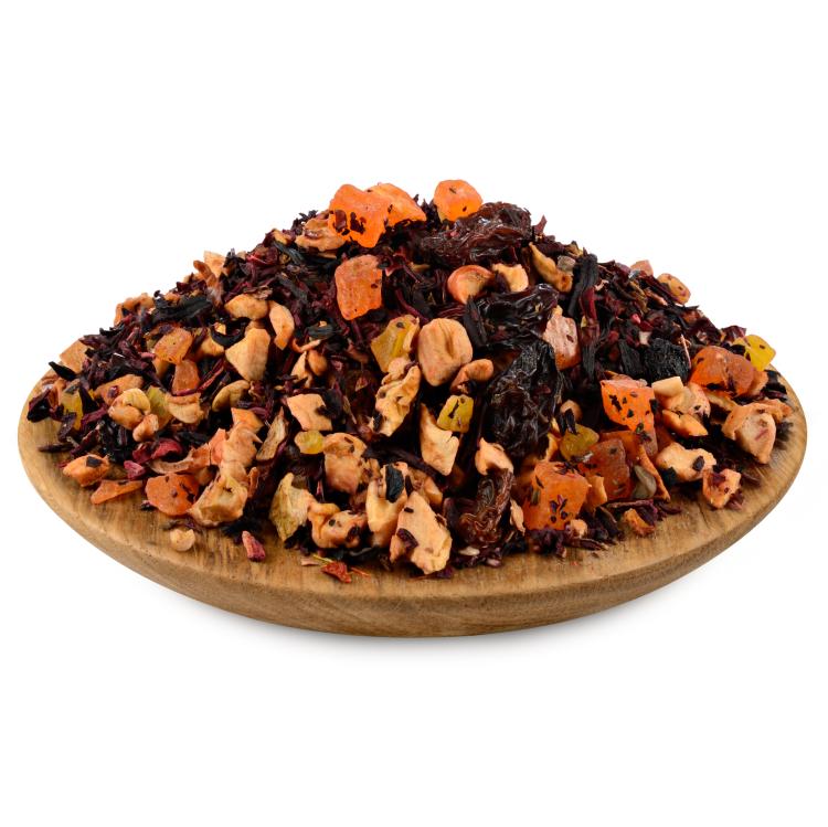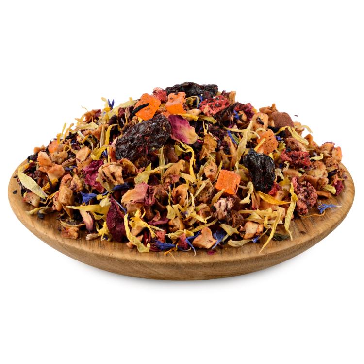 Состав: Каркаде, яблоки, груша, изюм, папайя, клубника, лепестки календулы, розы, василька, ароматизирован натуральными маслами.