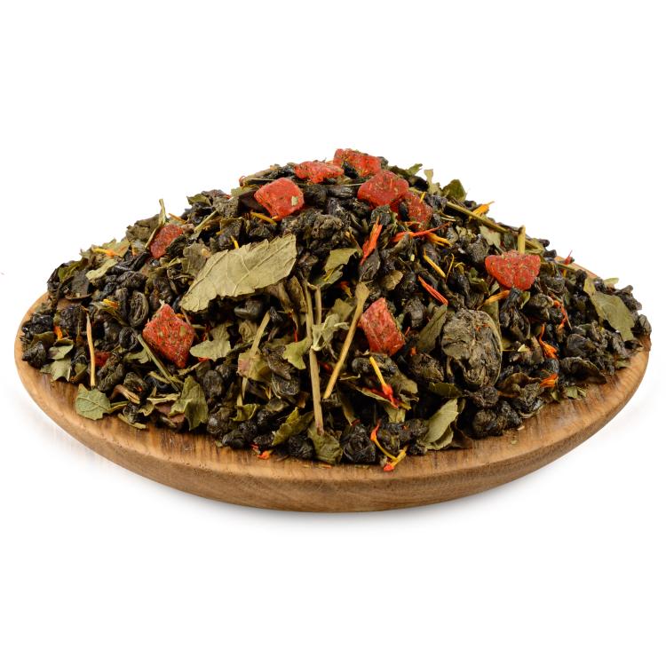 Зеленый чай «Земляника со сливками» представляет собой изысканный купаж китайского зеленого чая, цельных ягод лесной земляники и нежных сливок. Эта уникальная комбинация дополнена ароматическими маслами, которые усиливают вкус напитка, делая его еще более насыщенным и запоминающимся. Вдыхая его душистый аромат, вы мгновенно переноситесь мыслями на живописную лесную поляну, где в зарослях густой травы прячутся столь любимые с детства красные ягодки земляники. Почувствуйте вкус детства вместе с нашим совершенным чаем!