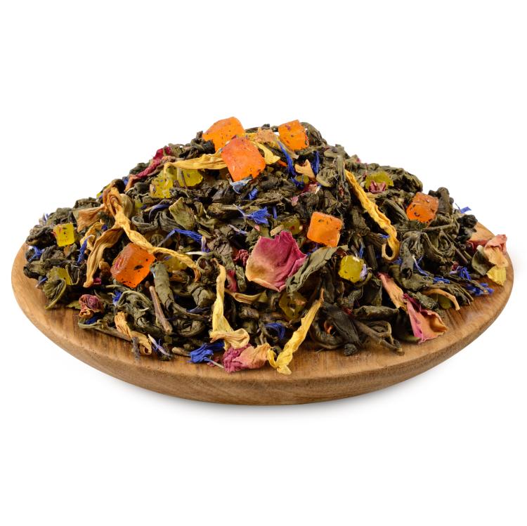 Это удивительное произведение искусства в мире чаев, представляющее собой уникальный и тщательно подобранный купаж, сочетающий в себе лучшие сорта зелёного чая с экзотическими фруктовыми и цветочными нотами. В основе лежат два популярных сорта: нежная и утончённая Сенча и крепкий, насыщенный Ганпаудер, каждый из которых привносит свои характерные черты в общую картину вкуса. Однако истинное волшебство этому чаю дарят дополнительные ингредиенты — кусочки папайи и цедра апельсина. Кусочки папайи придают чаю изысканную сладость и экзотический аромат. Этот тропический фрукт, богатый витаминами и антиоксидантами, придаёт напитку нежные, но запоминающиеся сладкие ноты, которые служат гармоничным дополнением к вкусам зелёного чая. Насладитесь каждым глотком этого изысканного напитка и откройте для себя богатство вкусовых сочетаний, которые подарят вам минуты истинного наслаждения и помогут окунуться в атмосферу гармонии и спокойствия.