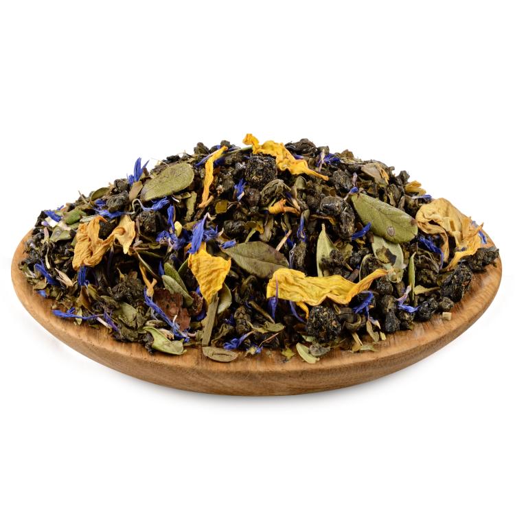 Зелёный чай «Мечты Шаха» дополнен яркими элементами, такими как желтый подсолнух, символизирующий тепло и солнечное настроение, и небесно-голубой василёк, придающий напитку воздушность и свежесть. Этот чай способен подарить истинное эстетическое наслаждение благодаря богатой палитре купажа.