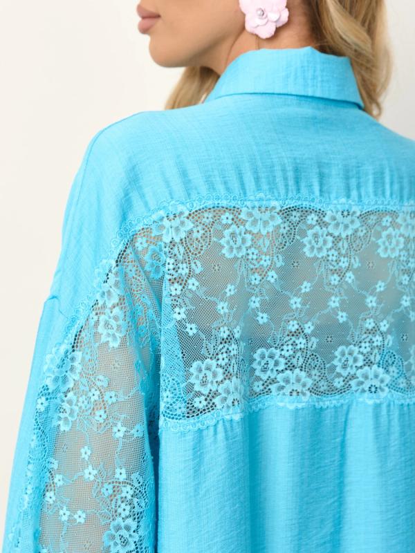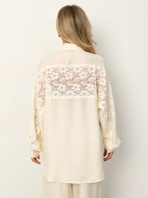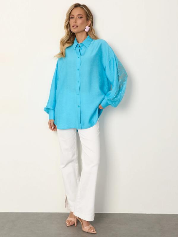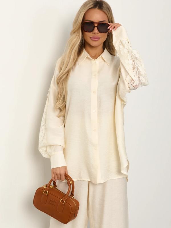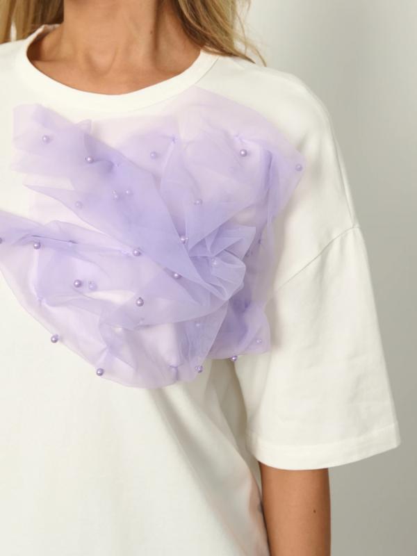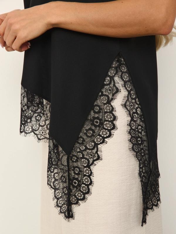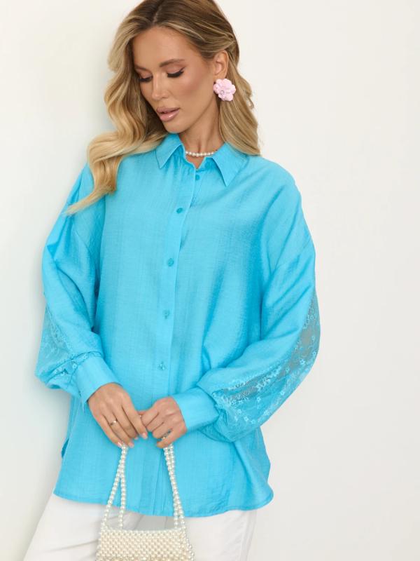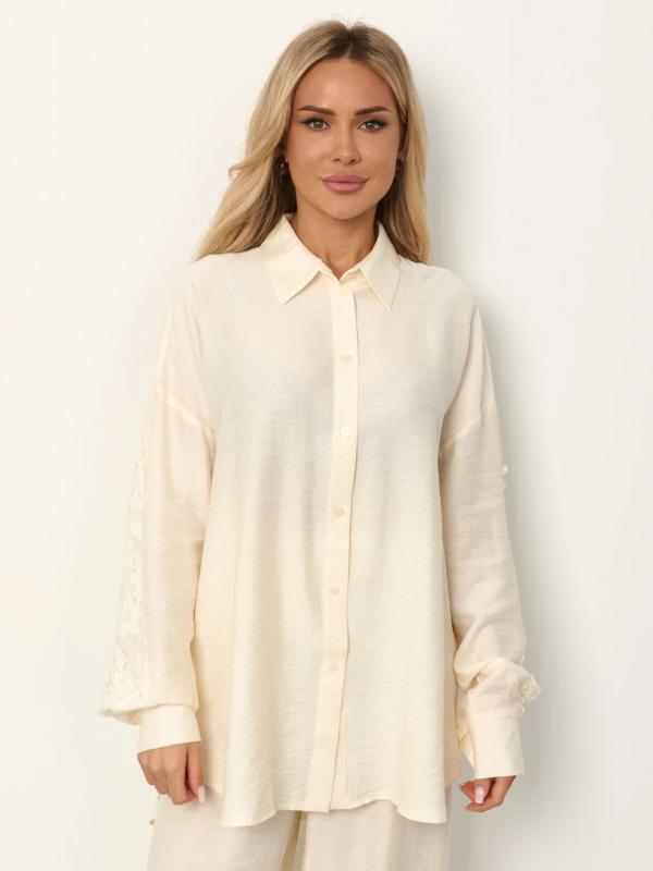 Длинные втачные рукава из сетки в мелкий горошек украшены бусинами.