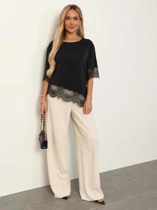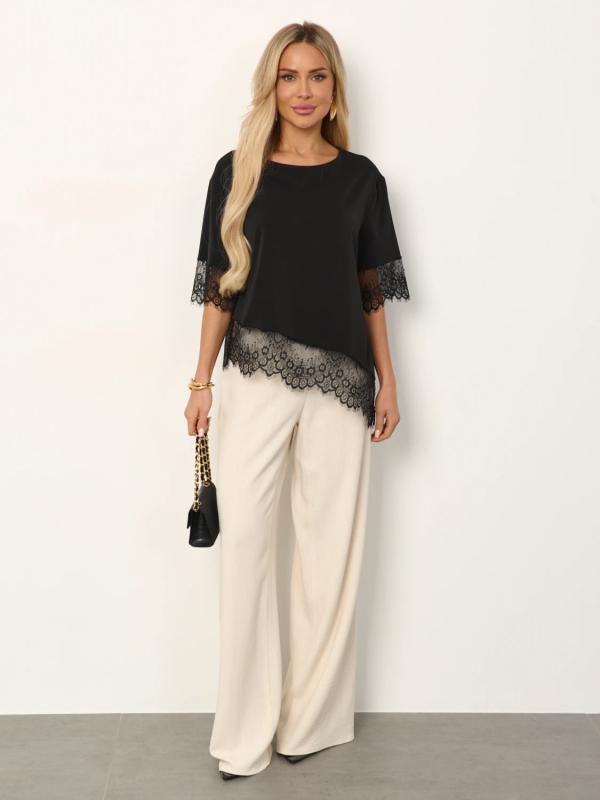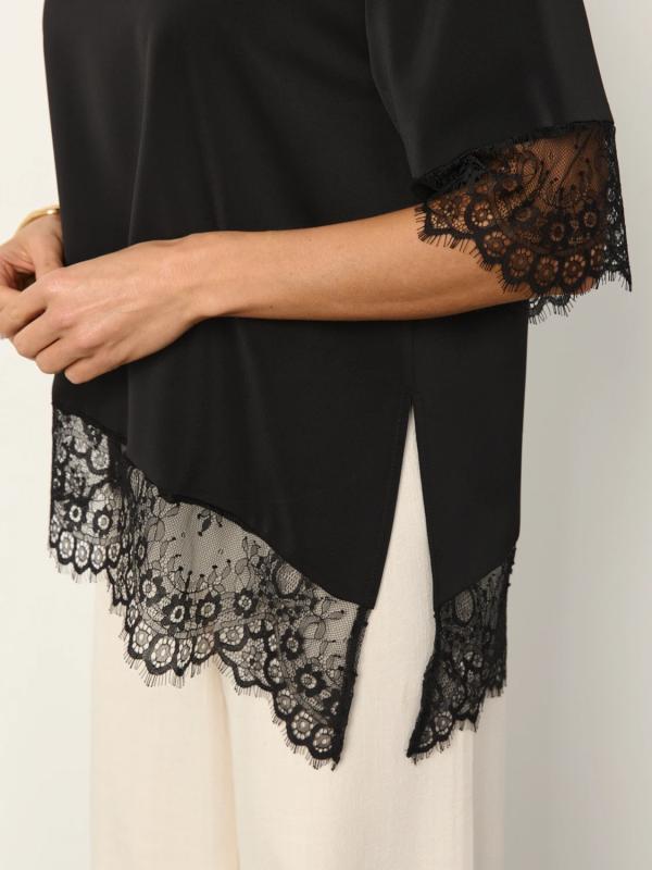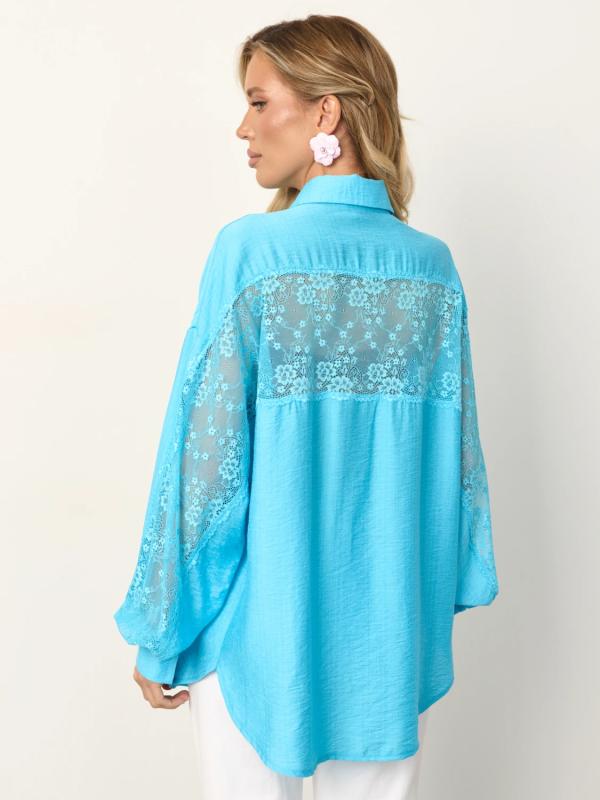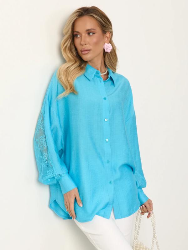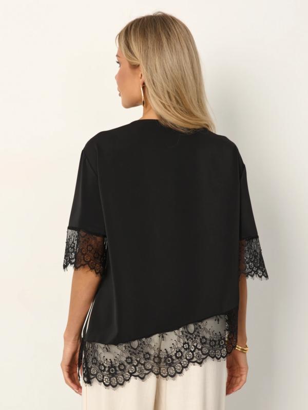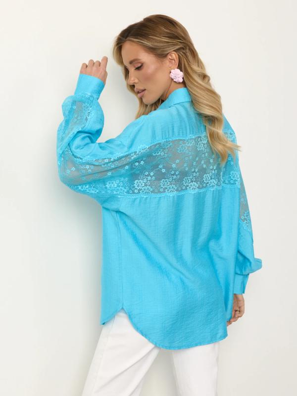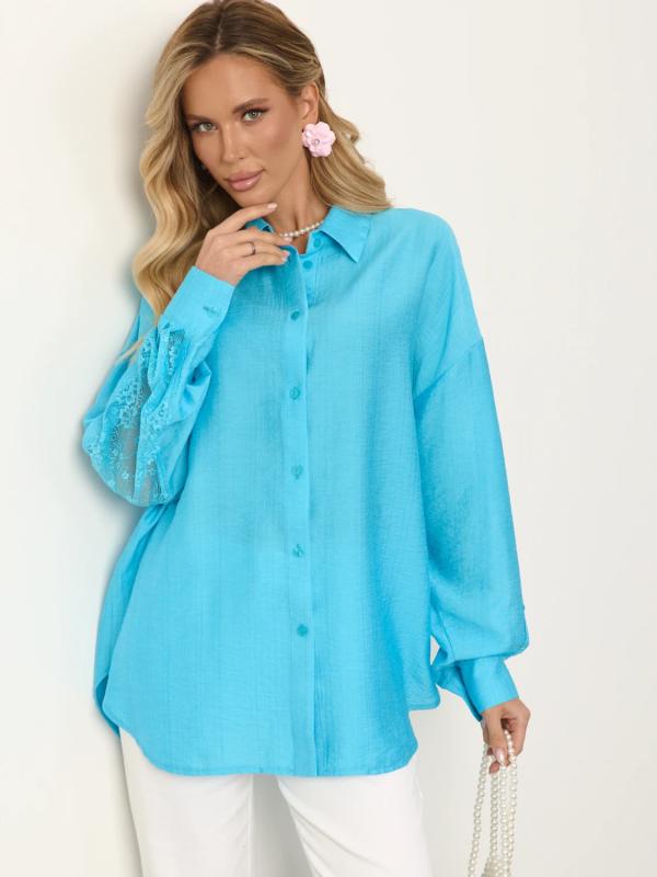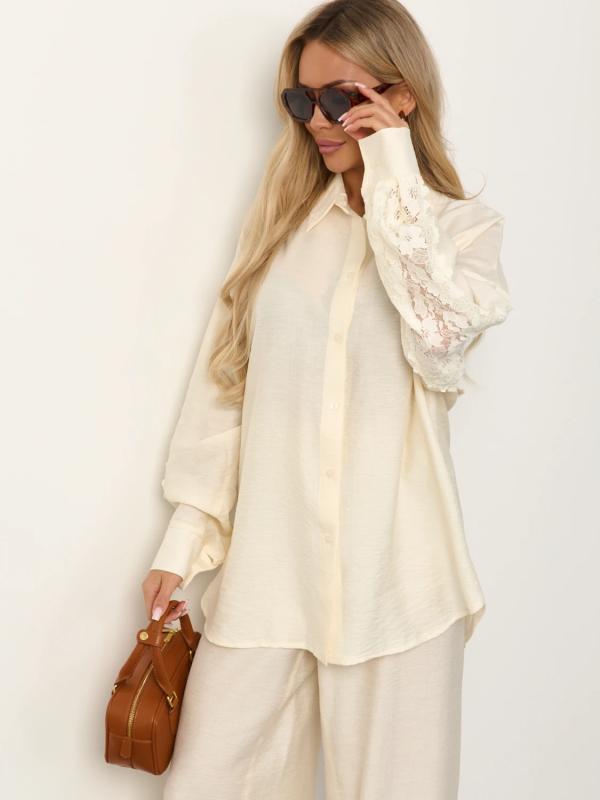 Длинные втачные рукава из сетки в мелкий горошек украшены бусинами.