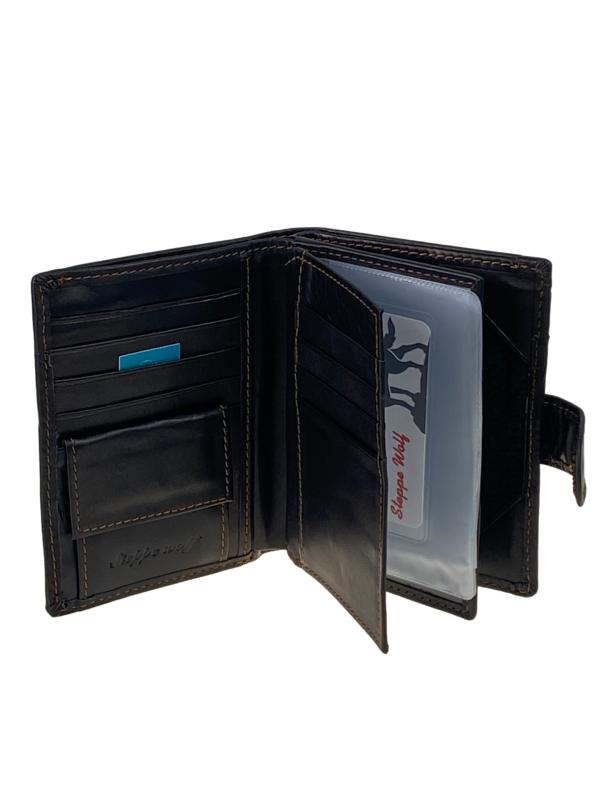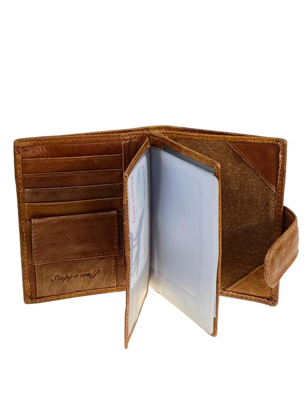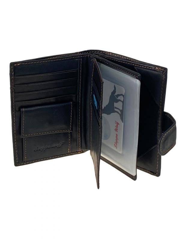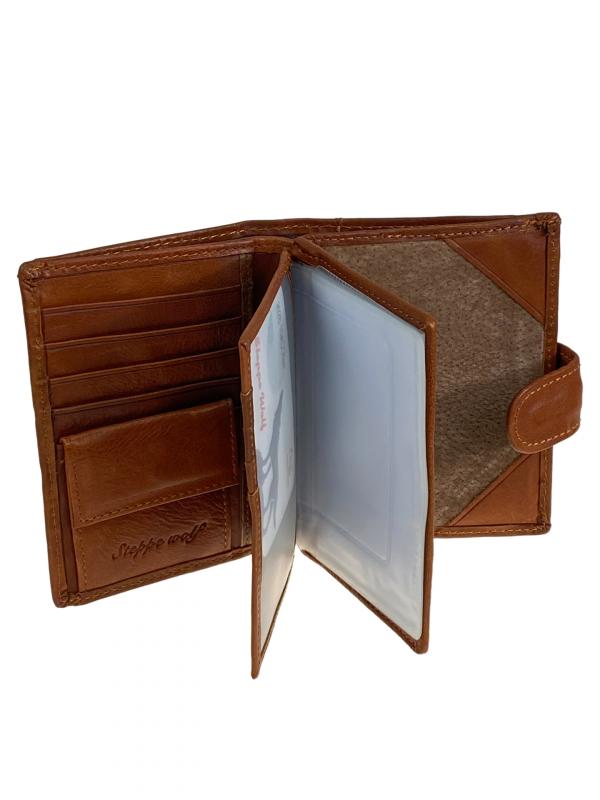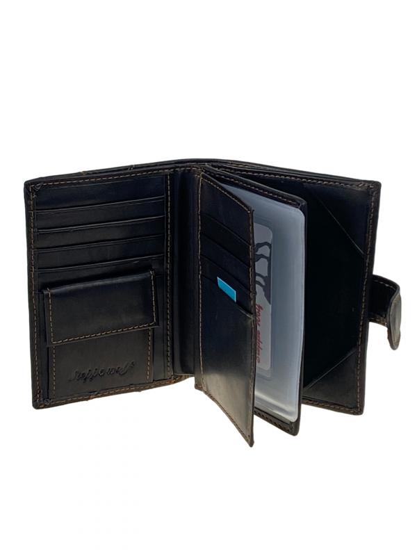 Многофункциональный мужской кошелёк-органайзер. Выполнен из натуральной кожи, вмещает деньги, пластиковые карты и различные документы. Кошелёк закрывается на горт с кнопкой. Внутри полноразмерное отделение под купюры с потайным карманом на молнии . На левом развороте отдел под мелочь на кнопке и четыре отсека для пластиковых карт. По середине обложка для автодокументов, внутри пластиковый файл для водительского удостоверения, 4 файла для СРТС и сложенный файл формата A5. На правом развороте отдел под паспорт. Длина: 9.5 см