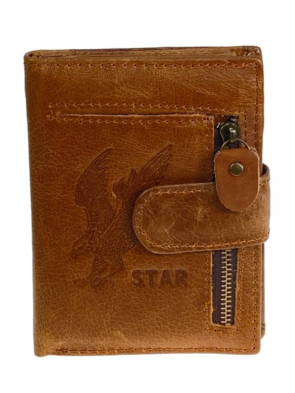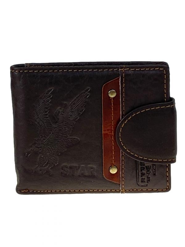 Горизонтальное мужское портмоне из натуральной кожи. Внутри 2 полноразмерных отделения под купюры, в одном из них потайной карман на молнии. На левом развороте прозрачное окно под карты. В центре отдел под карты с прозрачным окном . На правой стороне отдел под мелочь на кнопке . Цвет коричневый. Длина: 11 см