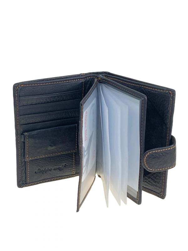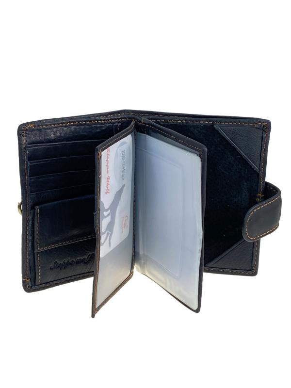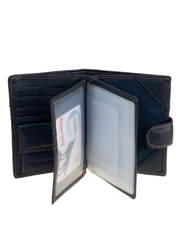 Горизонтальное мужское портмоне из натуральной кожи. Внутри 2 полноразмерных отделения под купюры, в одном из них потайной карман на молнии. На левом развороте прозрачное окно под карты. В центре отдел под карты с прозрачным окном . На правой стороне отдел под мелочь на кнопке . Цвет черный. Длина: 11 см