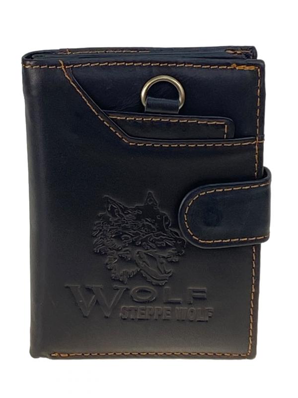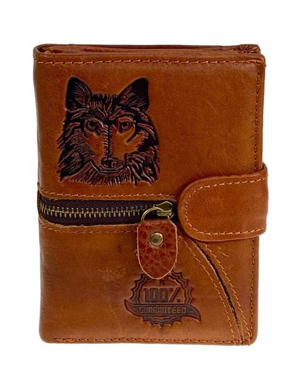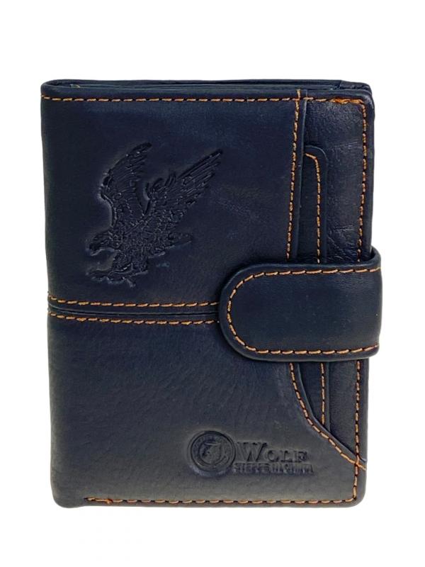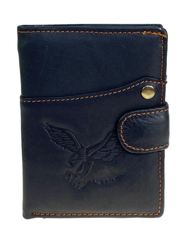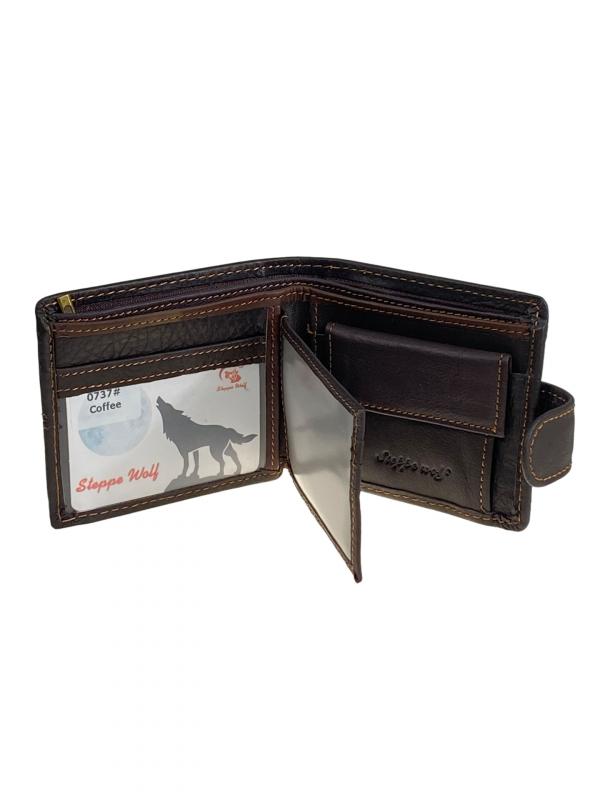 Мужское портмоне из натуральной кожи. Внутри два отделения под купюры и потайной карман на молнии. На левом развороте 3 отсека для пластиковых карт и два отсека с пластиковым окном. На правой стороне карман на кнопке для мелочи. Длина: 11.5 см