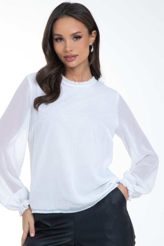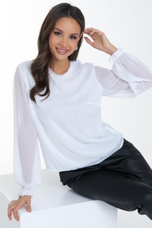 Очаровательная свободная шифоновая блузка, подчеркивающее женственность - отличное решение на каждый день или на праздник для современной стильной женщины. Шикарная модель с объемными длинными рукавами выполнена из высококачественного шифона. Круглая горловина оформлена рюшей с застежкой на пуговицу на спине.Нежная блузка из шифона на трикотажном подкладе, по переду сделаны вытачки на грудь, рукава втачные пышные, длинные, снизу собраны на резинку.