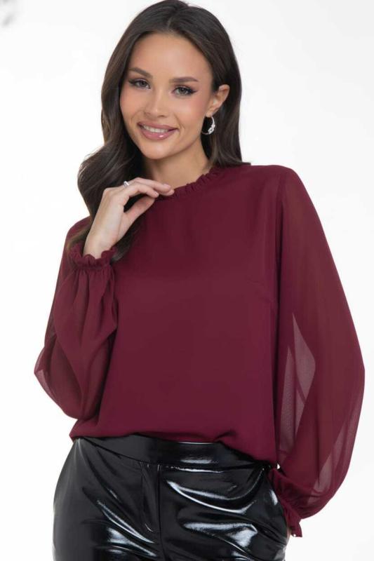 Очаровательная свободная шифоновая блузка, подчеркивающее женственность - отличное решение на каждый день или на праздник для современной стильной женщины. Шикарная модель с объемными длинными рукавами выполнена из высококачественного шифона. Круглая горловина оформлена рюшей с застежкой на пуговицу на спине. Нежная блузка из шифона на трикотажном подкладе, по переду сделаны вытачки на грудь, рукава втачные, пышные, длинные, снизу собраны на резинку.