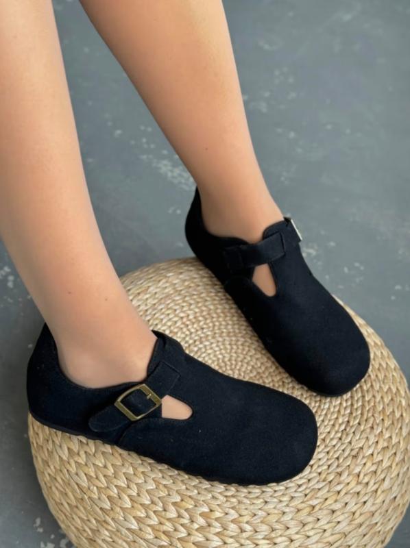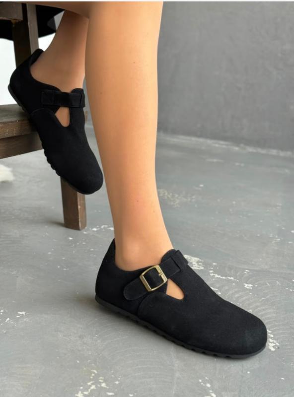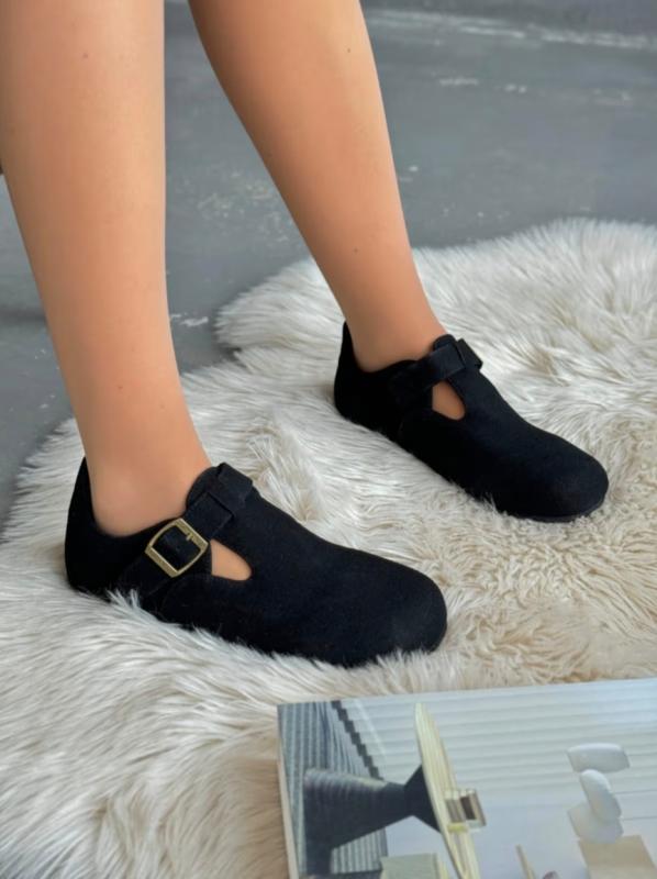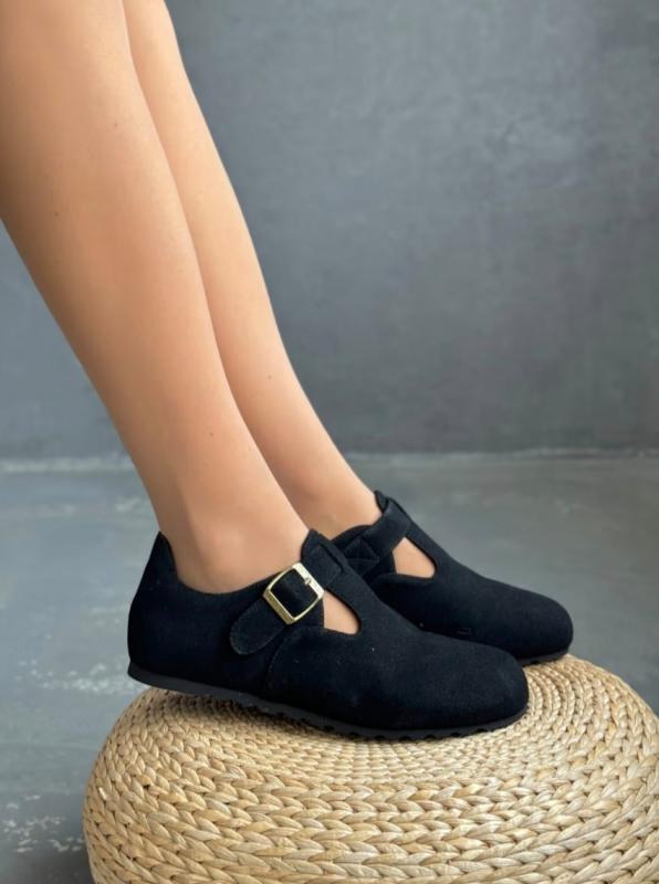 Женские весенние туфли с ремешком. Эти удобные и практичные туфли изготовлены из искусственной замши черного цвета. Они имеют элегантный дизайн с ремешком и металлической пряжкой, что придает им стильный и современный вид. Туфли имеют плоскую подошву и идеально подходят для весеннего сезона. Они удобны для повседневной носки и могут быть сочетаемы с различными образами. Благодаря своему простому и универсальному дизайну, эти туфли станут отличным дополнением к вашему гардеробу.