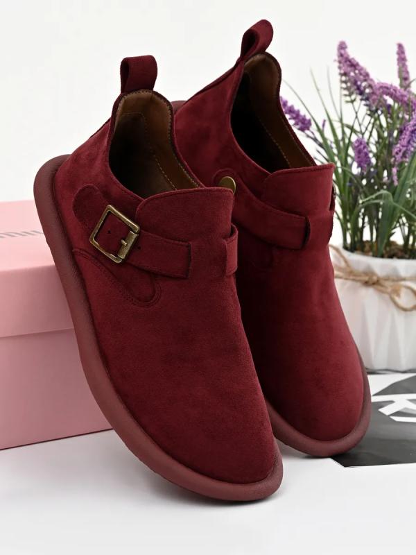Женские осенние ботинки. Удобные и практичные ботинки из искусственной замши бордового цвета с декоративной пряжкой и молнией сбоку. Идеальны для повседневной носки, обеспечивают комфорт и надежность. Подходят для различных типов одежды и могут быть использованы в различных погодных условиях.