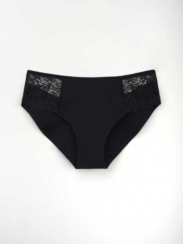 Женские трусы от торговой марки Индефини. Трусы-слипы из полиамида, черного цвета, с кружевными вставками и обрамлением, на мягкой резинке, средней посадки.