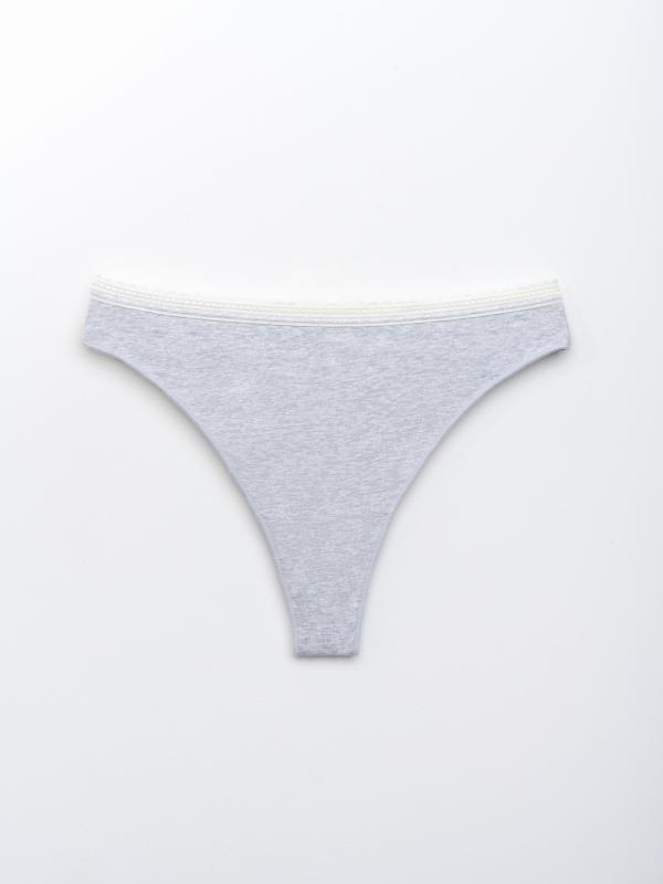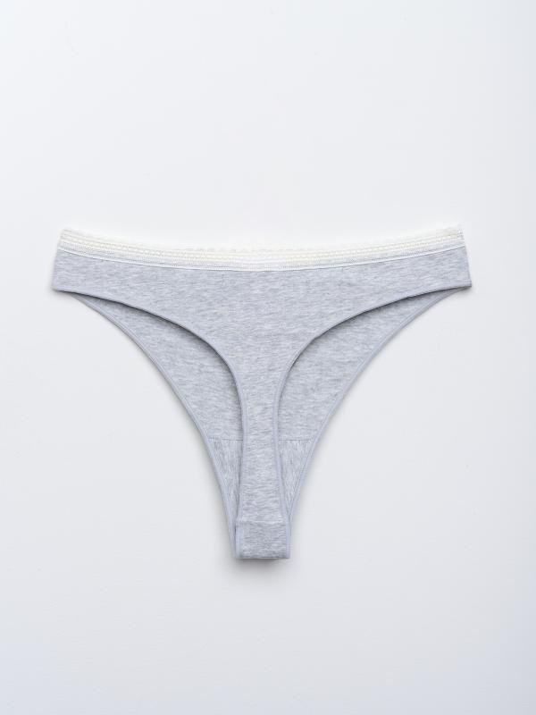 Стринги из мягкого хлопкового трикотажа — прекрасный выбор для ценителей женственного нижнего белья. Кружевная окантовка с фестонами и благородный меланжево-серый оттенок создают аккуратный, сдержанный, но очень женственный образ. Открытая линия ягодиц подчеркивает силуэт. Мягкая резинка не натирает, а небольшое количество эластана в составе делает белье долговечным и эластичным. Материал подходит даже для чувствительной кожи.