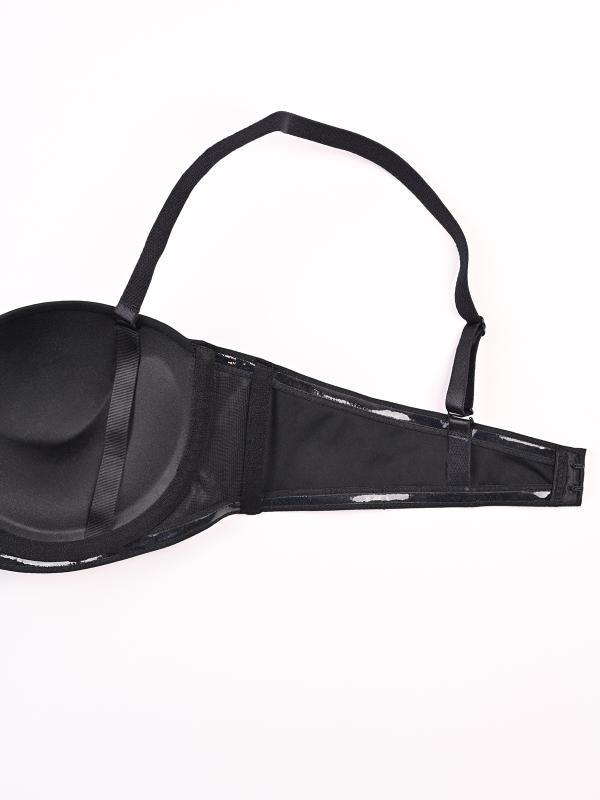 Бюстгальтер черного цвета с эффектом PUSH UP. Поддерживает и приподнимает грудь. Силиконовая лента не дает бюстгальтеру сползать или «гулять» по телу, особенно при активных движениях. Можно носить без бретелей — бюстгальтер держится за счет силиконовых элементов и конструкции чашек. Особенности — формованные чашки с пуш-ап и косточками — силикон на поясе и по нижнему краю для поддержки — съемные регулируемые бретели