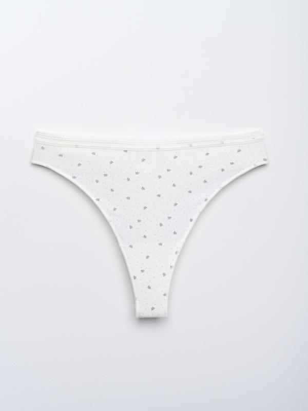 Стринги из мягкого хлопкового трикотажа — прекрасный выбор для ценителей женственного нижнего белья. Кружевная окантовка с фестонами, нежный оттенок белого и акцент на открытых ягодицах придают образу неотразимую притягательность, а небольшое количество эластана в составе делает белье долговечным и эластичным. Мягкая резинка не натирает, материал подходит даже для чувствительной кожи.