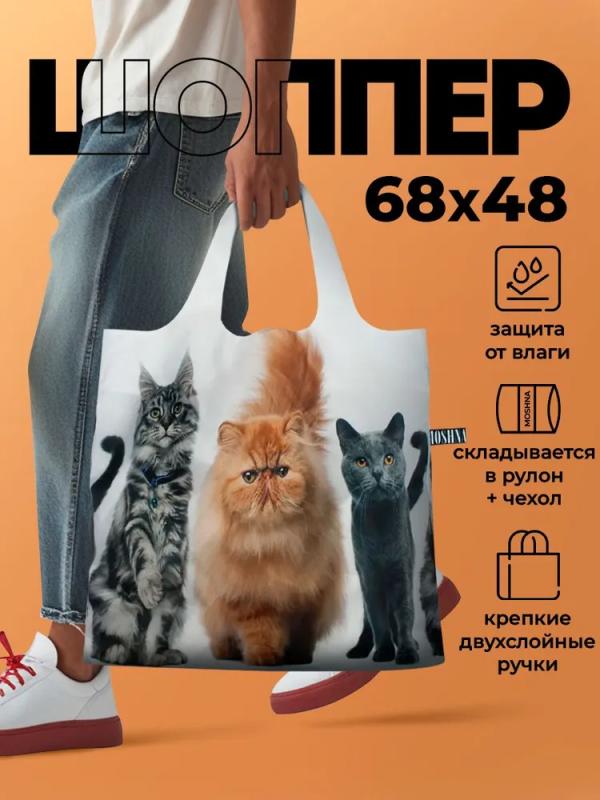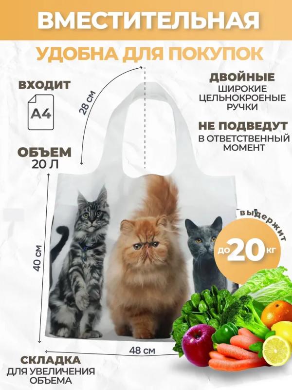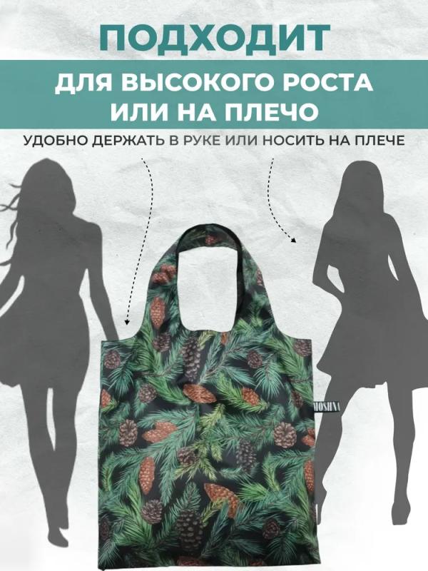 Ширина сумки 48 см, ручки длиной 28 см, дно раскладывается - 6 см. Резинка для фиксации сумки в сложенном виде вшита в боковой шов. Ткань тонкая, но прочная, 100% полиэстер с водоотталкивающей пропиткой.