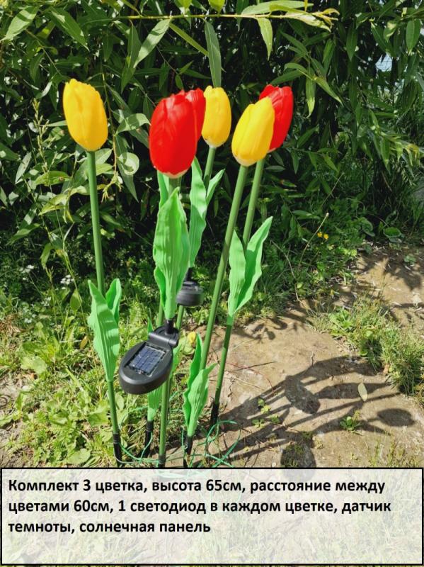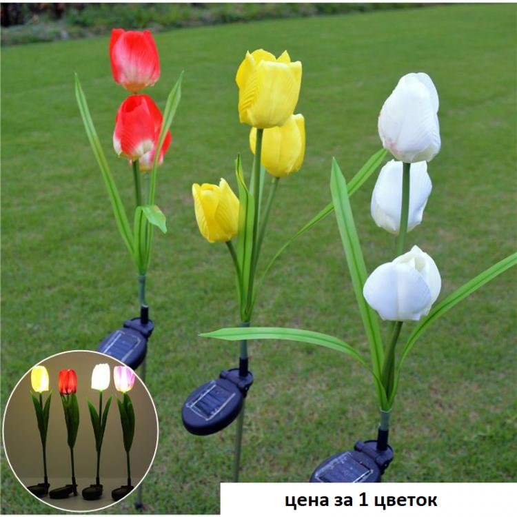Садовый светильник ТЮЛЬПАНЫ ЖЕЛТОГО, БЕЛОГО КРАСНОГО ЦВЕТА на солнечной батарее, 3LED, высота 70см,(цветы из ткани, на одной ножке 3 цветка), в упаковке 1 штука