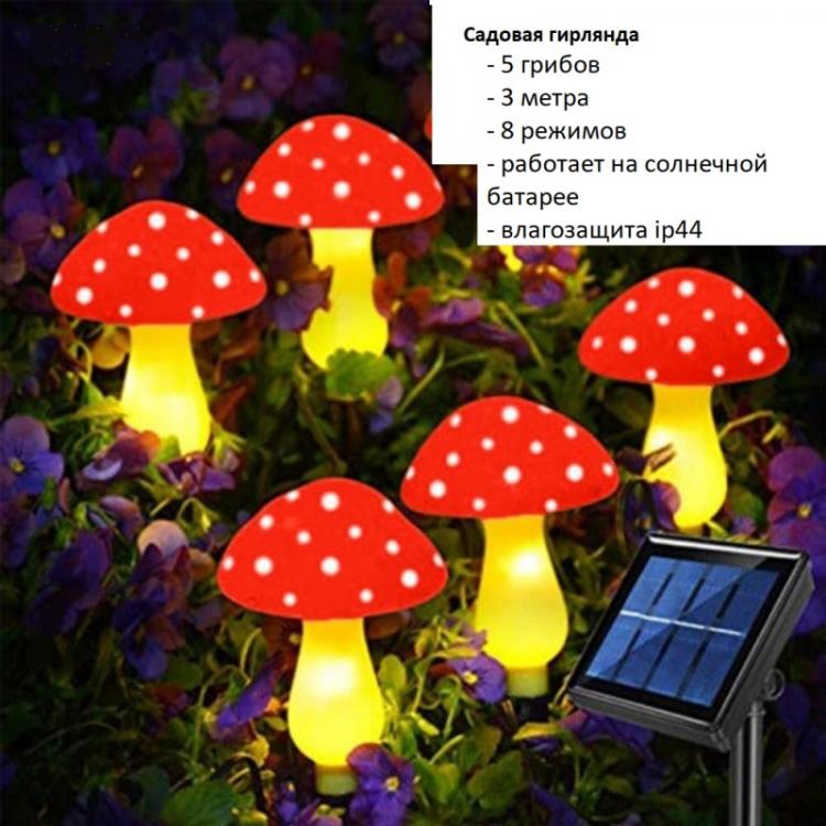 Садовая гирлянда Мухоморы, длина 3 метра, 5 грибочков в линии, работает на солечной батарее, 8 режимов работы. Солнечную батарею разместить в хорошо освещенное место, время зарядки от 6 до 10 часов (в зависимости от погодных условий), время работы 6-8 часов (на батарее установлен датчик темноты, начинает работать, когда темнеет)