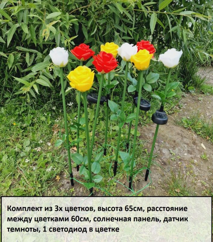 Силиконовый светильник Розы 3 цветка на одной линии, высота цветов 65см, растояние между цветами 60см, цвета Желтый и Красный. Цветы сделаны из качественного силикона, в каждом по 1 светодиоду. Стоит датчик темноты, днем заряжаються, вечером светятся