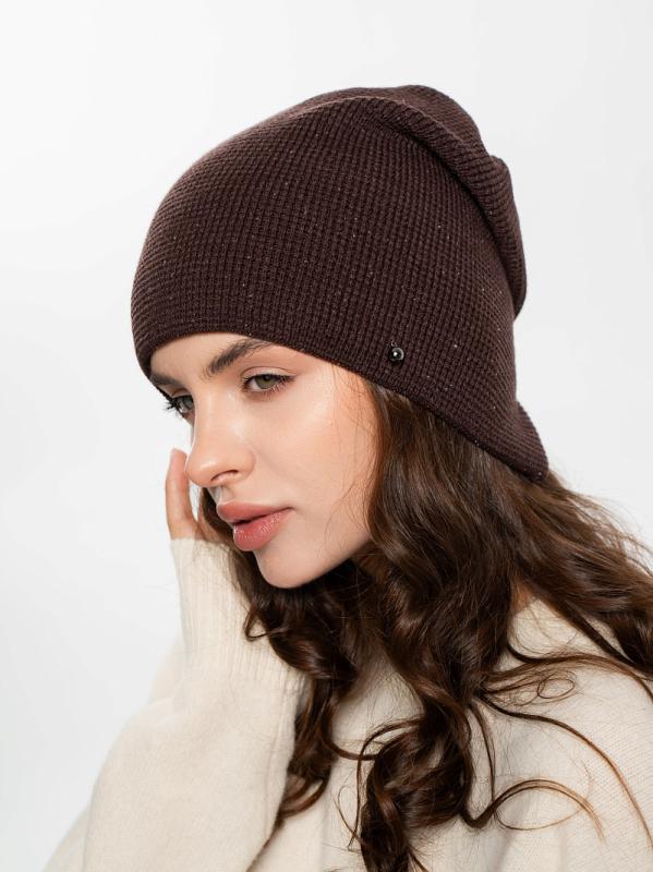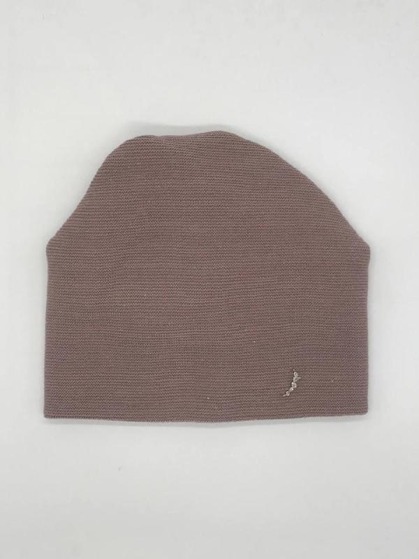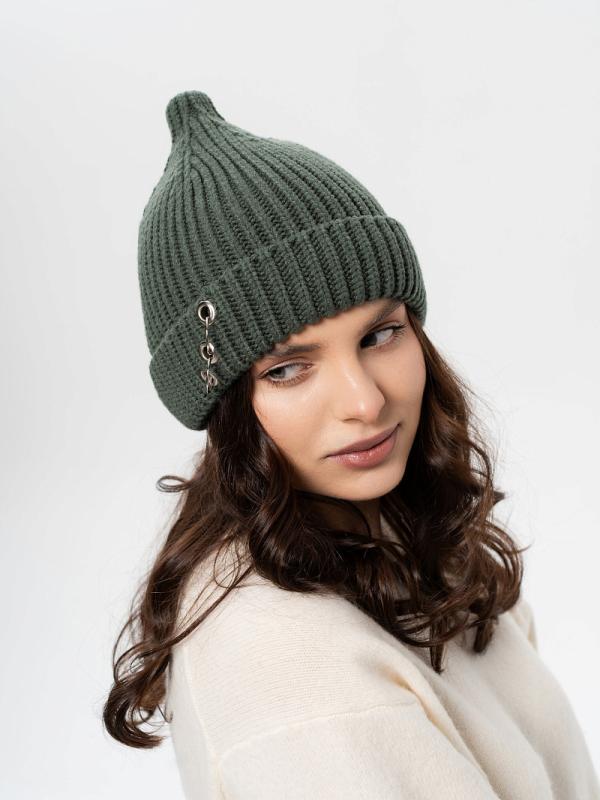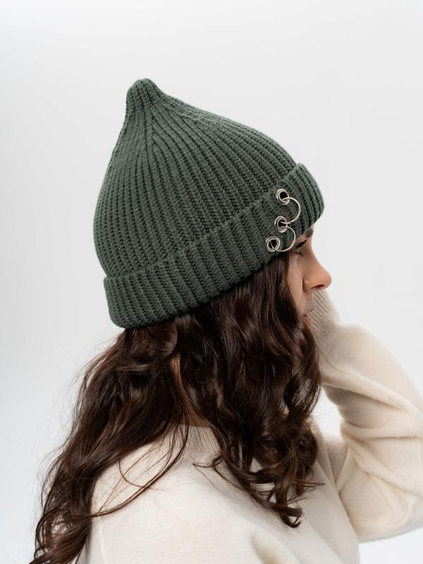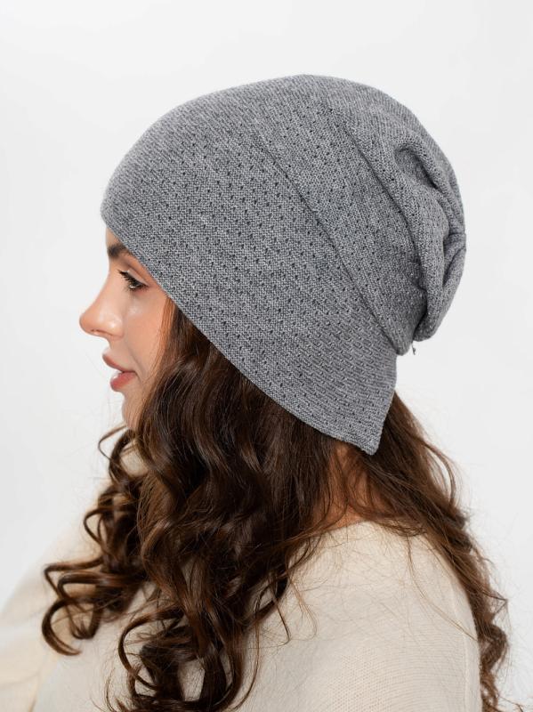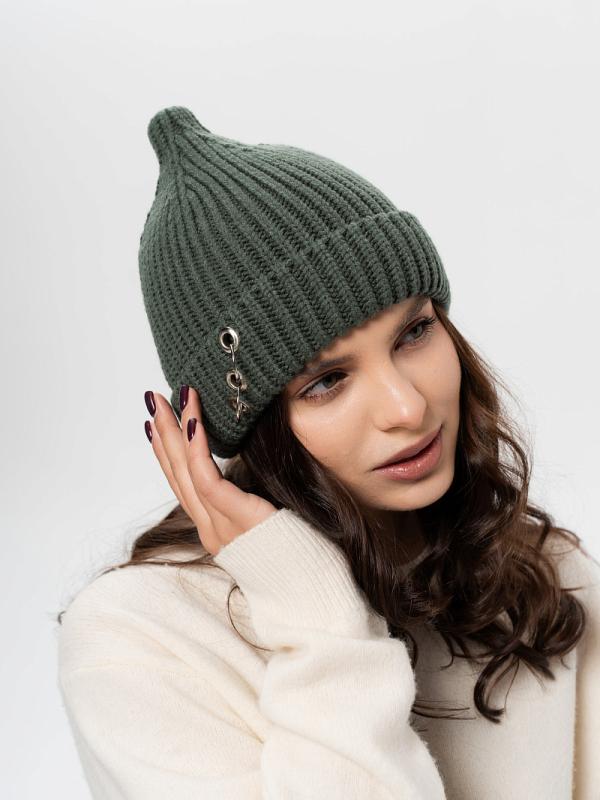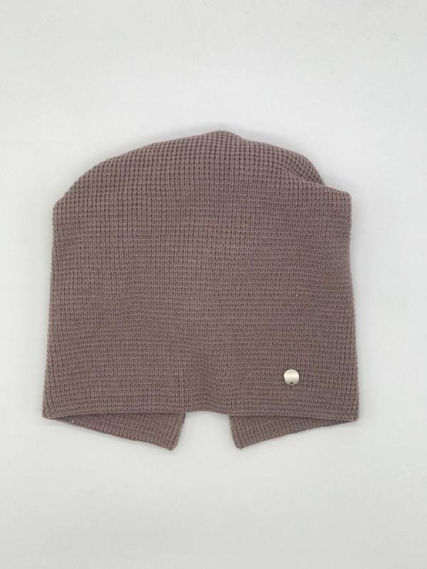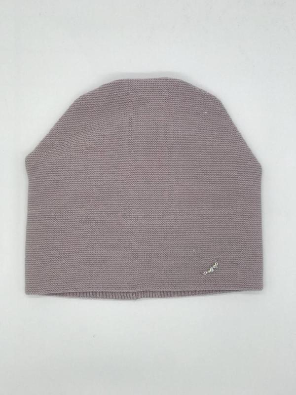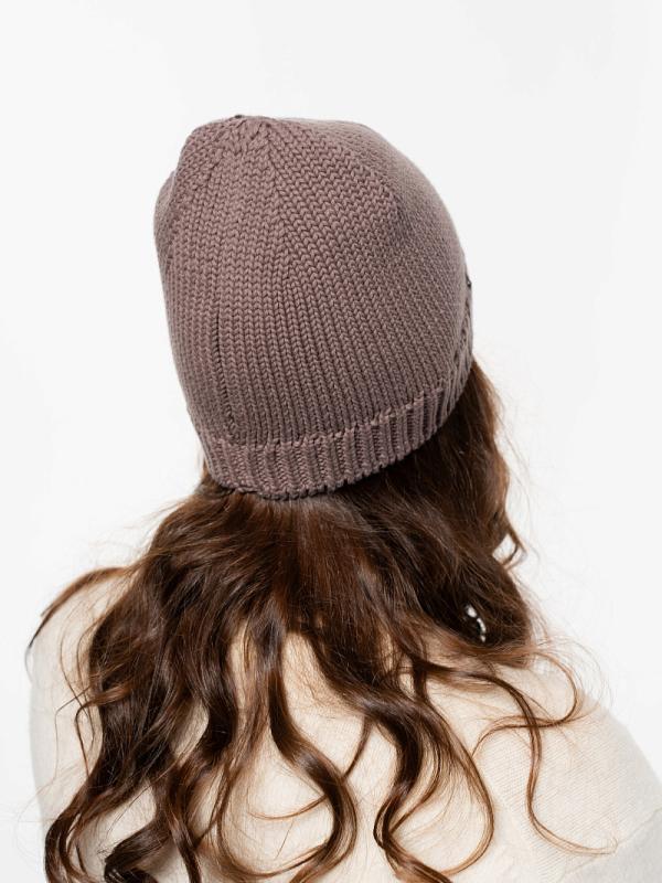 Шапка двойная, фактурной вязки, с металлическом декором ,расшивкой сзади и разрезом