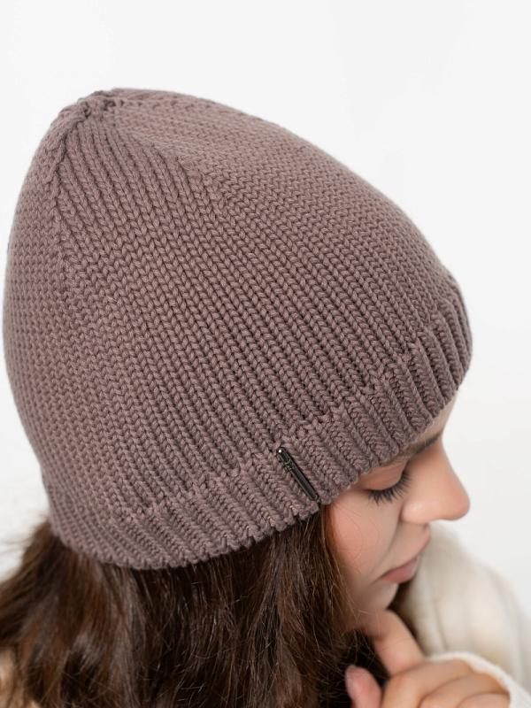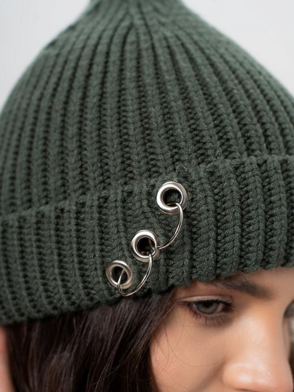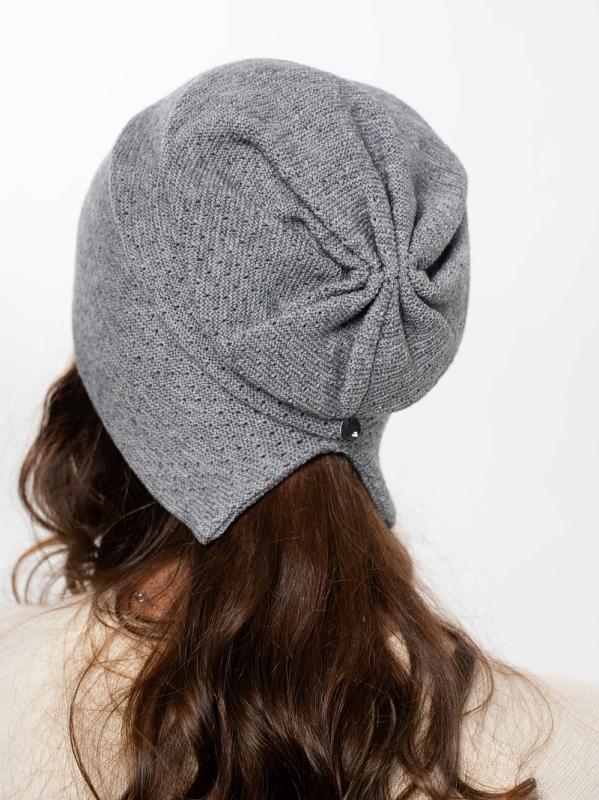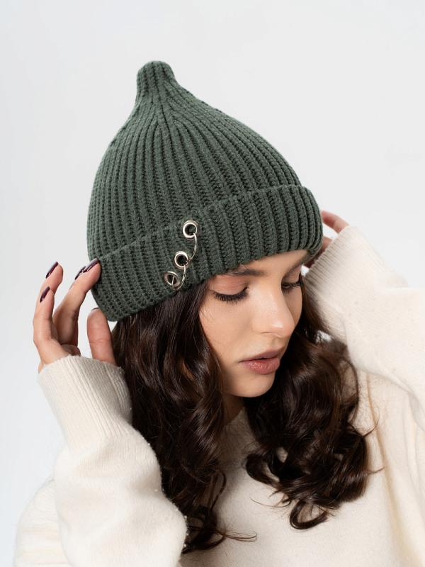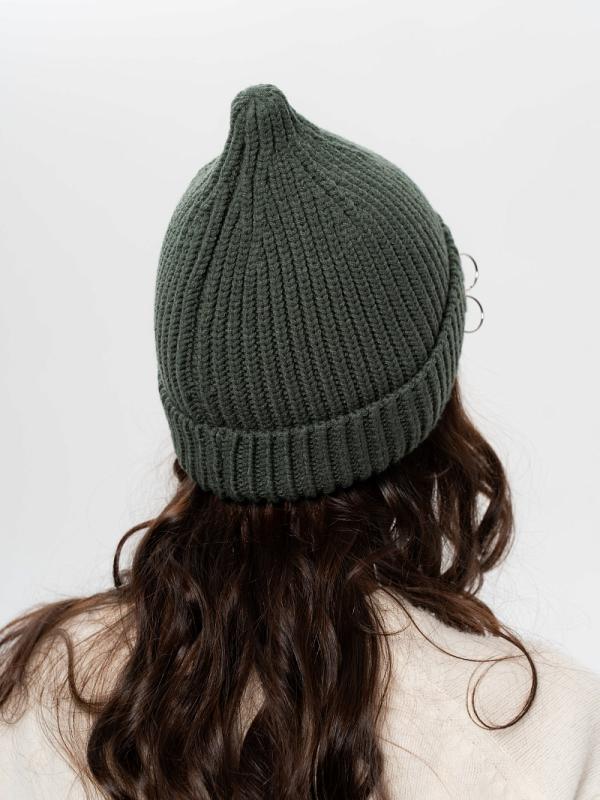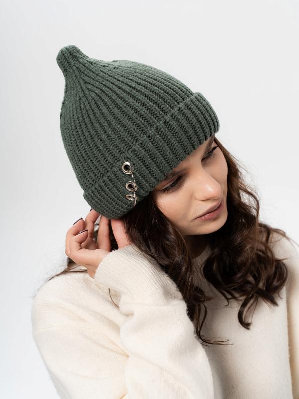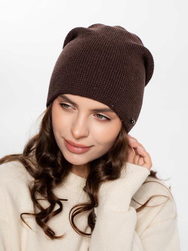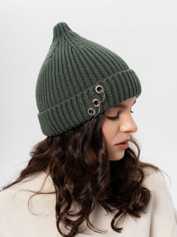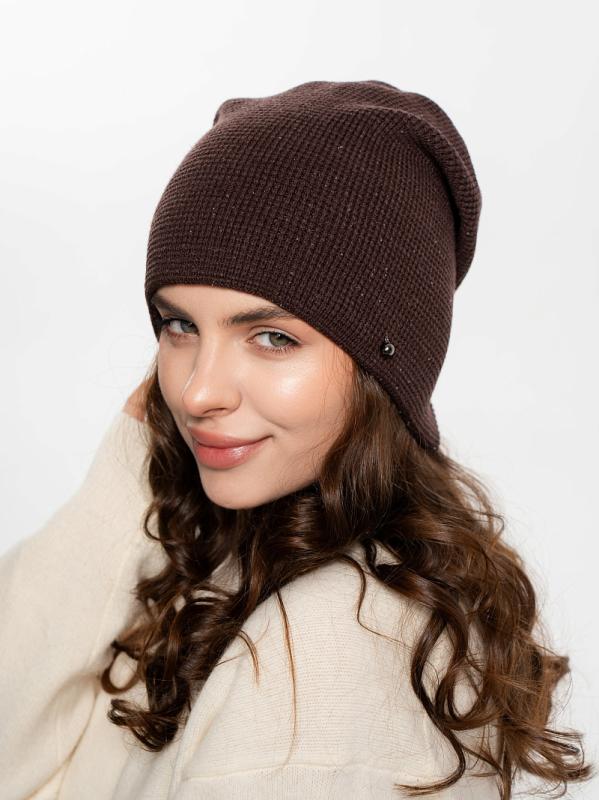 Шапка двойная, фактурной вязки, с металлическом декором ,расшивкой сзади и разрезом