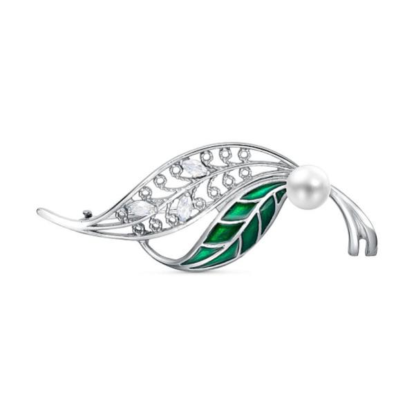 Брошь Веточка из серебра с жемчугом, фианитами и эмалью Код товара: 1602024