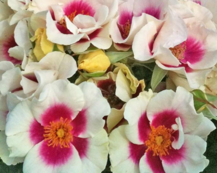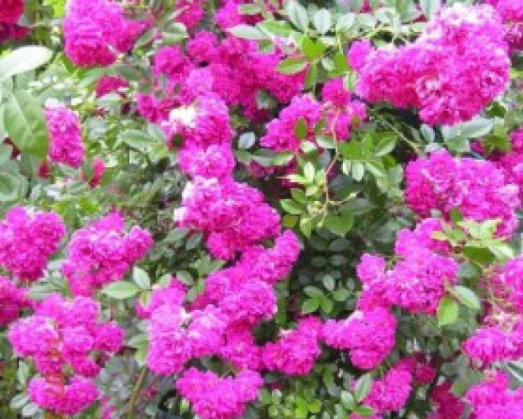 Цветение этой розы восхищает своей красотой: крупные кисти густомахровых, ярко-малиновых цветков с белой серединкой создают завораживающий образ. Важно отметить, что цветки начинают свою жизнь в яркой малиновой гамме, затем постепенно выгорают до пурпурного, а с оборотной стороны лепестки становятся серебристо-розовыми.