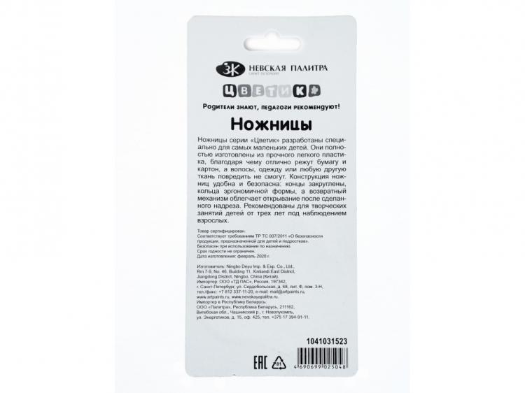 Ножницы серии «Цветик» разработаны специально для самых маленьких детей. Они полностью изготовлены из прочного легкого пластика, благодаря чему отлично режут бумагу и картон, а волосы, одежду или любую другую ткань повредить не смогут. Конструкция ножниц удобна и безопасна: концы закруглены, кольца эргономичной формы, а возвратный механизм облегчает открывание после сделанного надреза. Рекомендованы для творческих занятий детей от трех лет под наблюдением взрослых. Размеры: - общая длина135 мм, - длина лезвий - 50 мм. Товар безопасен при использовании по назначению. Товар сертифицирован. Соответствует требованиям ТР ТС 007-2011 «О безопасности продукции, предназначенной для детей и подростков». Срок годности не ограничен. Производитель: DK ART Ningbo DEYU Imp. &