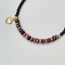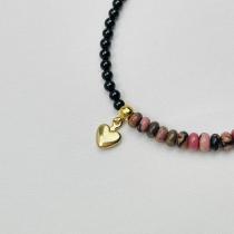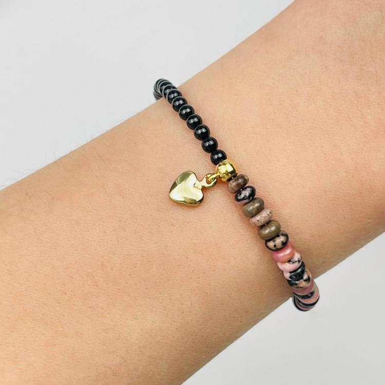 Браслет из черного Агата и Родонита с подвеской "Сердце", 17 см + – 18,5 см +, 3 мм, гладкий, Бразилия