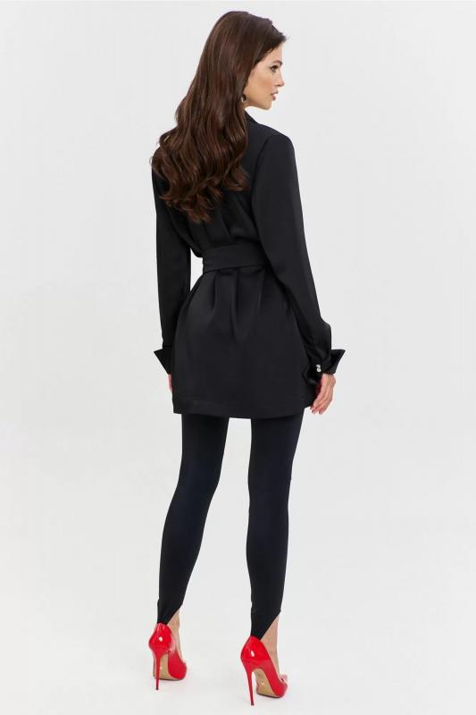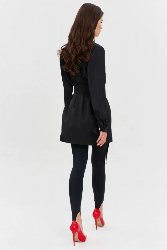 Платье свободного кроя, длиной до середины бедра. На левом переде настрочен накладной карман. Воротник пиджачного типа. Застежка по переду потайная на петли и пуговицы. Рукава одношовные, втачные, длинные. По низу рукава обработан разрез, односторонние складки и притачная манжета, которая застегивается на навесные петли и пуговицы. Платье дополняет съемный пояс с пряжкой.