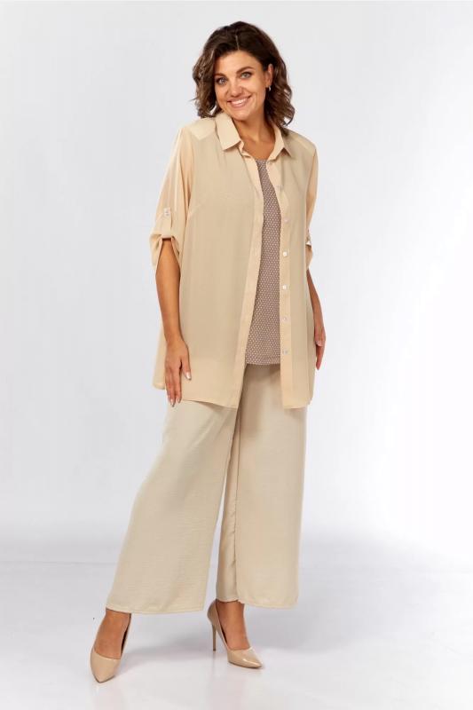 Этот изысканный женский комплект одежды — идеальное сочетание атмосферности и комфорта, созданное для современных модниц, ценительниц стиля и универсальности. В комплект входит легкая шифоновая блуза светло-бежевых тонов и мягкая трикотажная майка в теплых бежевых вариантах, которые вместе создают утонченный комплект для повседневной носки или особых случаев. Дизайн, вдохновленный минимализмом, с нотками классики, эластичной тканью майки и продуманными деталями блузы, создают идеальную посадку. Комплект доступен в размерах от 54 до 64 по размеру российской сетки, что делает его подходящим для фигур разных типов. Описание блузы: Шифоновая блуза — воплощение легкости и изысканности. Она застегивается на петли-пуговицы по притачной планке, что придает практичности и стиля. Воротник рубашечного типа придает классическую пышность, а втачные рукава ¾ с патами позволяют регулировать длину (от 31 до 41 см.). Мягкие порол