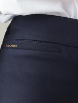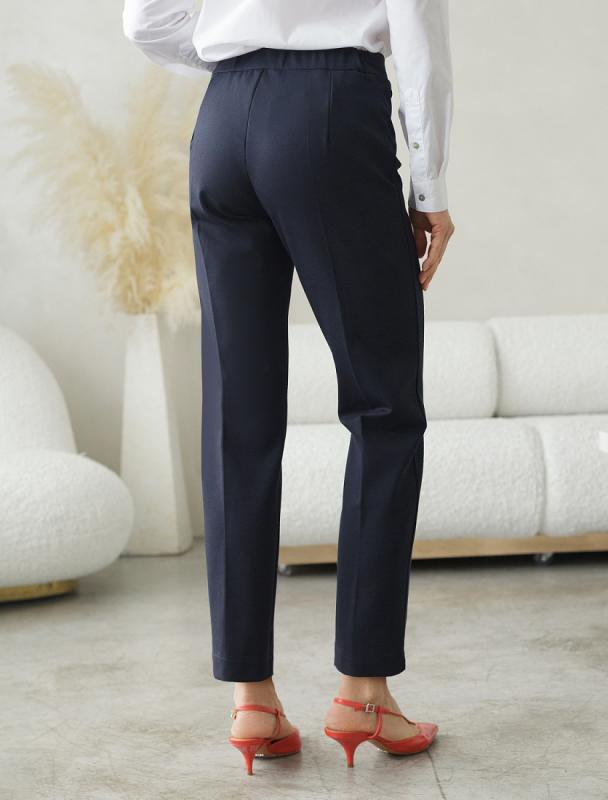 Брюки-дудочки выполнены из джерси. Модель дополнена резинкой сзади, одним вместительным карманом спереди и небольшими боковыми разрезами. Заутюженные стрелки и посадка на талии визуально вытягивают силуэт. Изделие хорошо держит форму, отлично тянется и почти не мнется во время использования. Идеальный вариант в офис или в повседневный классический стиль.