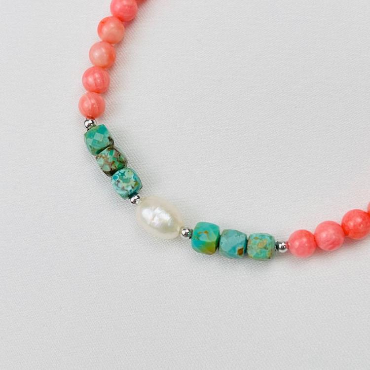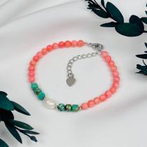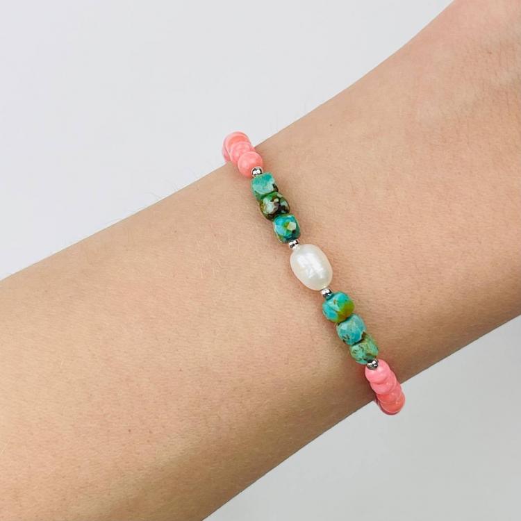 Браслет из розового Коралла, Бирюзы и Жемчуга, 16,5 см +, 4 мм, гладкий/Граненый, Индонезия
