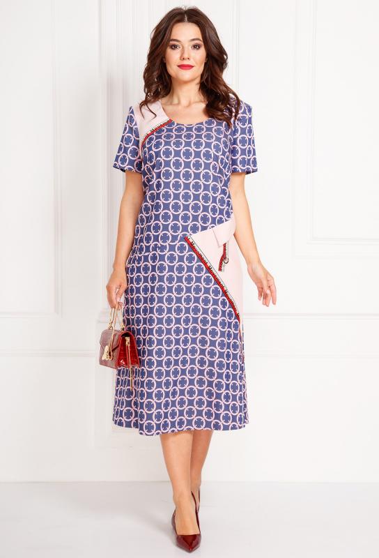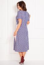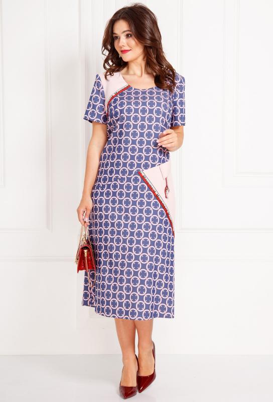 Платье А-силуэта, длиной за колено, выполнено из ткани джинс с набивным рисунком. В качестве отделки использована однотонная ткань, В качестве декора тесьма. Полочка платья с нагрудными вытачками, отрезной кокеткой из однотонной ткани и декора из тесьмы по правому плечу. По нижней части подрез по диагонали. Спинка со средним швом, в верхней части которого обработана потайная молния. Горловина круглой формы. Рукав одношовный, втачной, короткий..