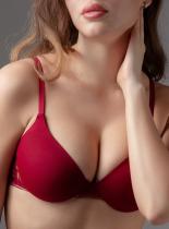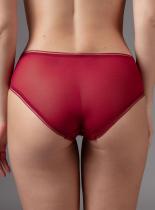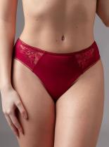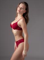 Комплект нижнего белья от торговой марки Индефини. В комплекте бюстгальтер и трусики. Бюстгальтер из полиамида, глубокого красного цвета, на косточках, с формованной чашкой, с поролоновой подкладкой, на кружевном поясе, с обрамлением, на тонких регулируемых лямках. Трусики, стринги и слипы, из полиамида, глубокого красного цвета, с кружевными вставками и обрамлением, средней посадки, на мягкой резинке.