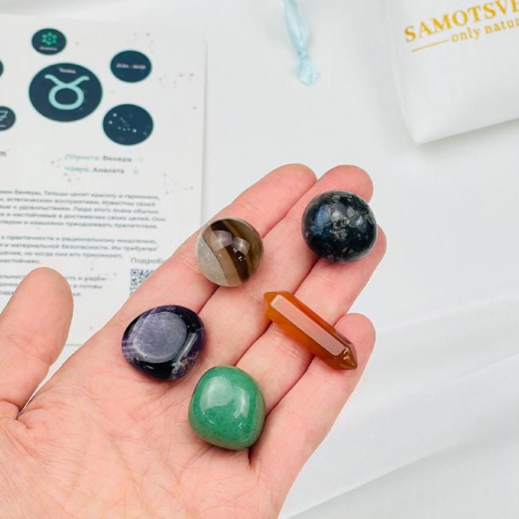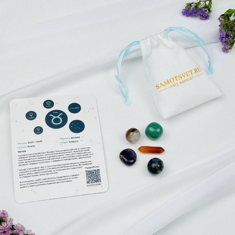 Этот набор из пяти тщательно подобранных камней создан специально для поддержки, укрепления и гармонизации энергии Тельца. Тельцы, как знак Земли, известны своей надежностью, практичностью, чувственностью и любовью к комфорту. Они ценят стабильность, материальное благополучие и красоту. Однако, их упрямство, консервативность и стремление к накопительству могут иногда приводить к нежеланию перемен, инертности и чрезмерной привязанности к материальным вещам. Этот набор камней призван помочь Тельцам сбалансировать свои качества, развить гибкость, направить свою энергию в творческое русло и раскрыть свой истинный потенциал. В наборе: Сердолик Энергия, мотивация и творчество. Сердолик помогает Тельцам активизировать свою жизненную энергию, повысить мотивацию и преодолеть инертность. Он стимулирует творческое мышление, помогает находить новые источники вдохновения и воплощать свои идеи в реальность. Сердолик также помогает Тельцам проявлять свою чувственность и наслаждаться простыми радостями жизни. Он помогает Те