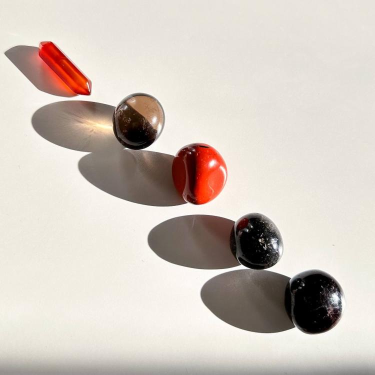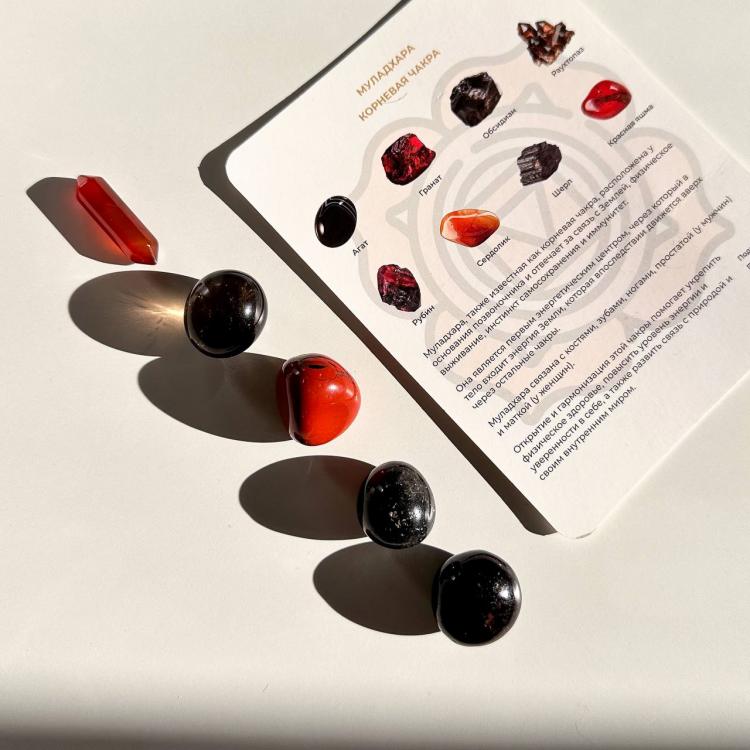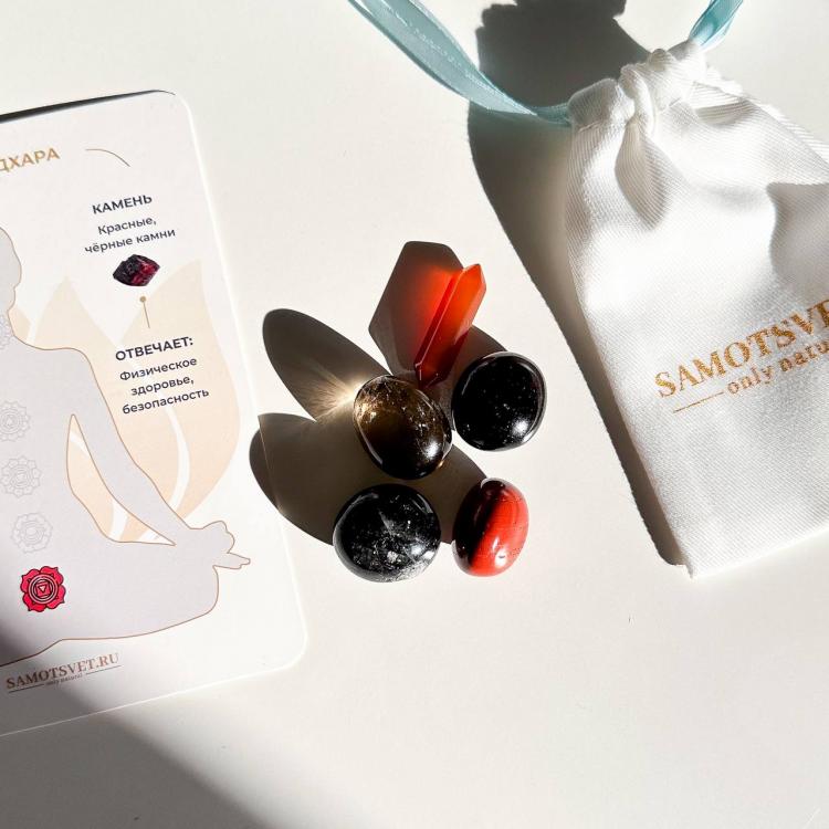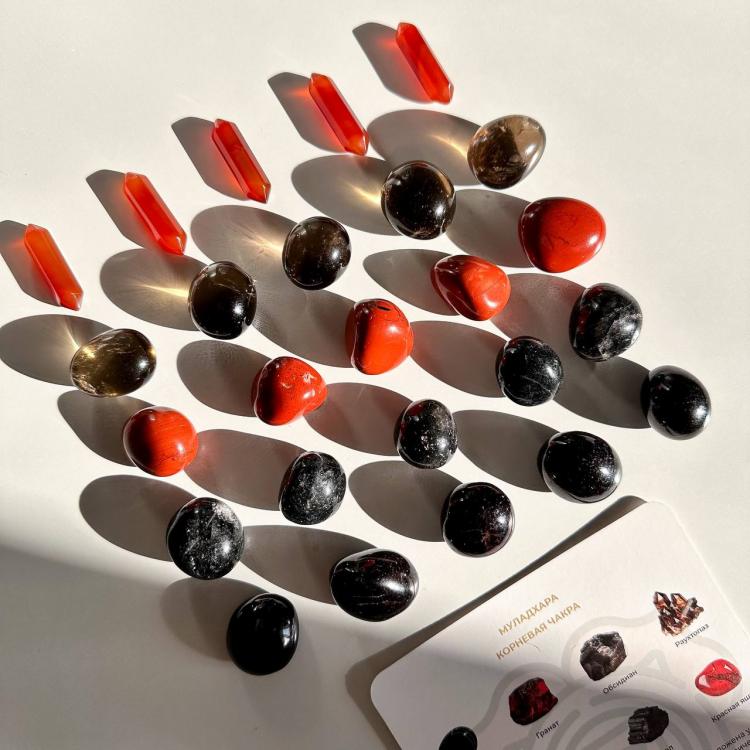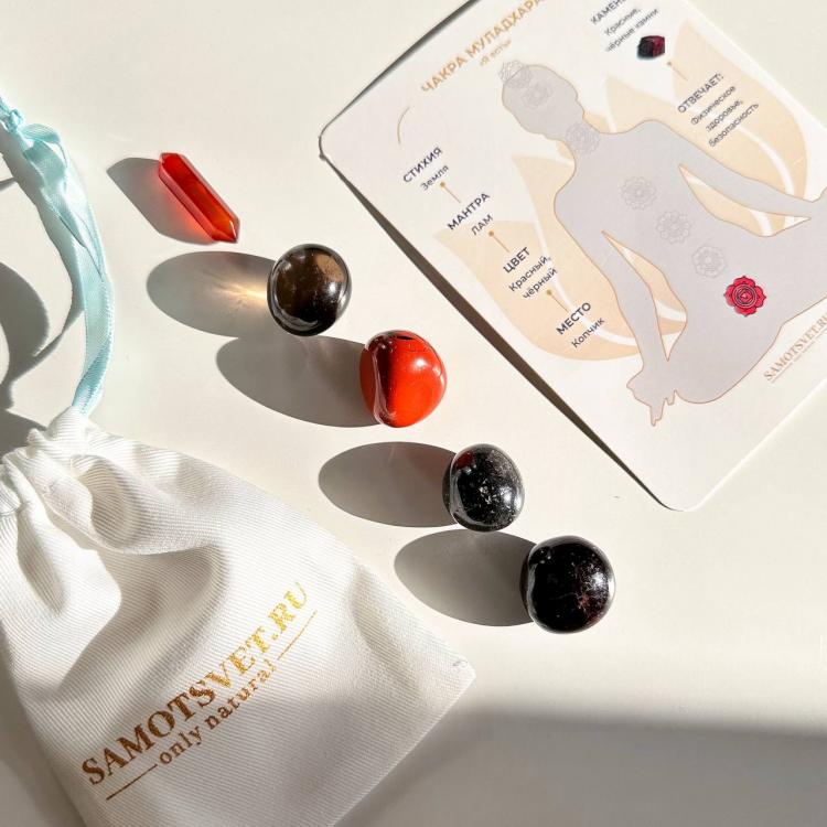 Этот набор из пяти тщательно подобранных камней создан специально для стимуляции, активации и гармонизации энергии чакры Муладхара, также известной как Корневая чакра. Муладхара чакра, расположенная в основании позвоночника (в области промежности), является центром безопасности, стабильности, выживания, заземления, физической силы и связи с землей. Гармонично работающая Муладхара чакра позволяет чувствовать себя в безопасности и уверенно, проявлять физическую выносливость, иметь крепкое здоровье, ощущать связь с землей и материальным миром, и удовлетворять свои основные потребности. Этот набор камней поможет вам развить эти способности, укрепить свою связь с землей и создать прочный фундамент для жизни. В наборе: Сердолик Энергия, смелость и витальность. Сердолик заряжает энергией, дарит смелость и повышает жизненный тонус. Он помогает преодолевать страхи и сомнения, связанные с выживанием и безопасностью. Сердолик также способствует заземлению и помогает оставаться в настоящем моменте. Раухтопаз (Дымчатый к