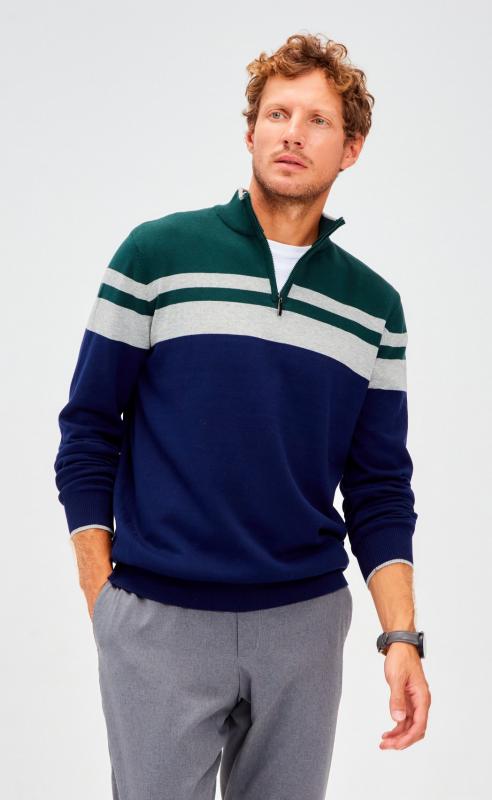 Джемпер мужской в полоску с воротником-стойкой на молнии F221-15-831 сине-зелёный
