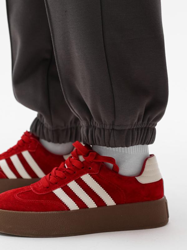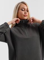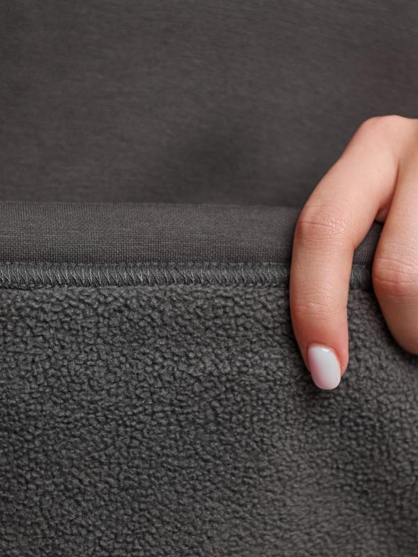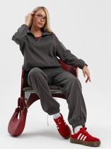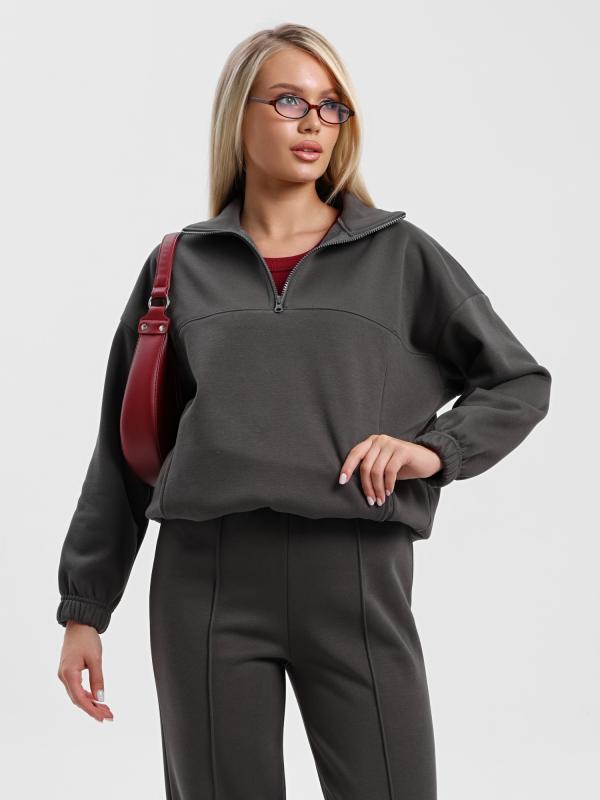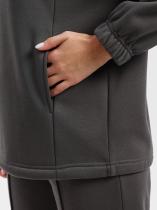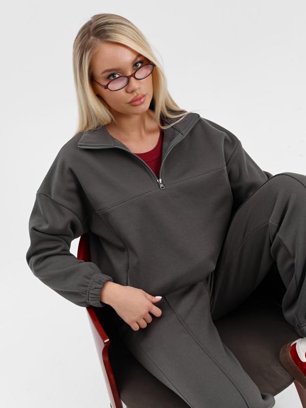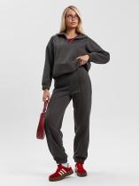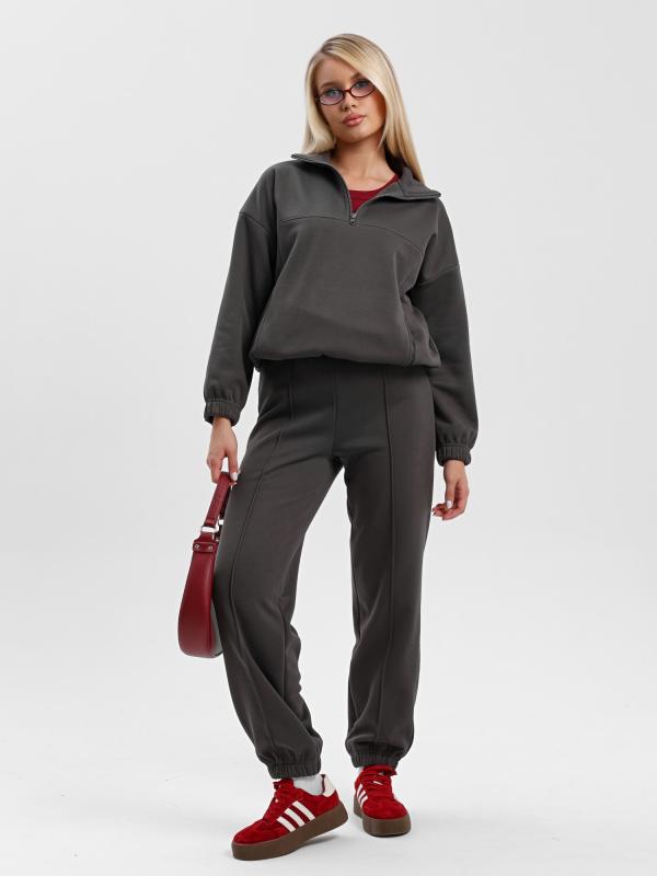 Костюм молодежный из трикотажного гладкокрашенного полотна «еврофлис», Джемпер - свободного покроя, с длинными втачными рукавами, нижние срезы которых обработаны эластичной тесьмой, воротником-стойкой и карманами в рельефных швах. Полочка - с отрезной кокеткой из двух частей, с застежкой "