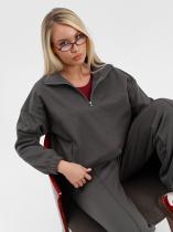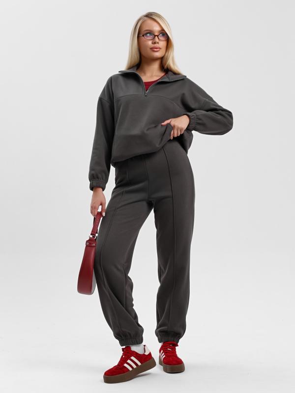 , обработанной в соединительном шве. Низ изделия с подгибкой и регулируется по ширине с помощью фиксатора.Брюки – длинные, полуприлегающего силуэта, на поясе с эластичной тесьмой внутри и карманами в боковых швах. Передние половины застрочены по центральным линиям.