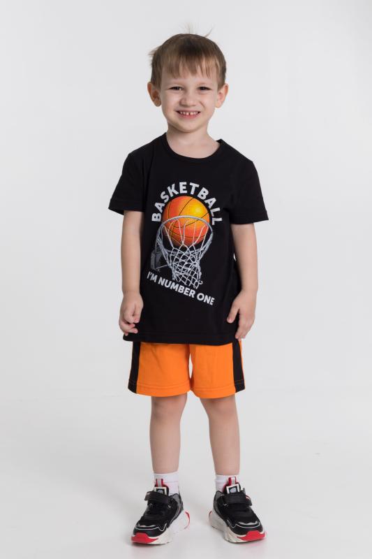 Летний костюм из кулирки 2-х цветов. Шорты с боковыми карманами и отделочной боковой полосой. Футболка - круглый вырез горловины, на полочке принт.