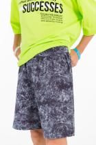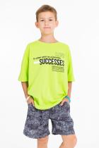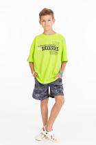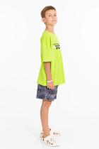 Костюм выполнен из хлопкового полотна. Футболка свободная, со спущенным рукавом и принтом спереди. Шорты свободные, с поясом на резине и боковыми карманами.