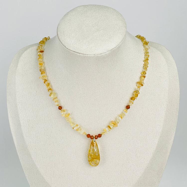 Колье из Цитрина и Граната "Спессартин" с кулоном из Рутилового кварца, 40 см + – 45 см +, Бразилия