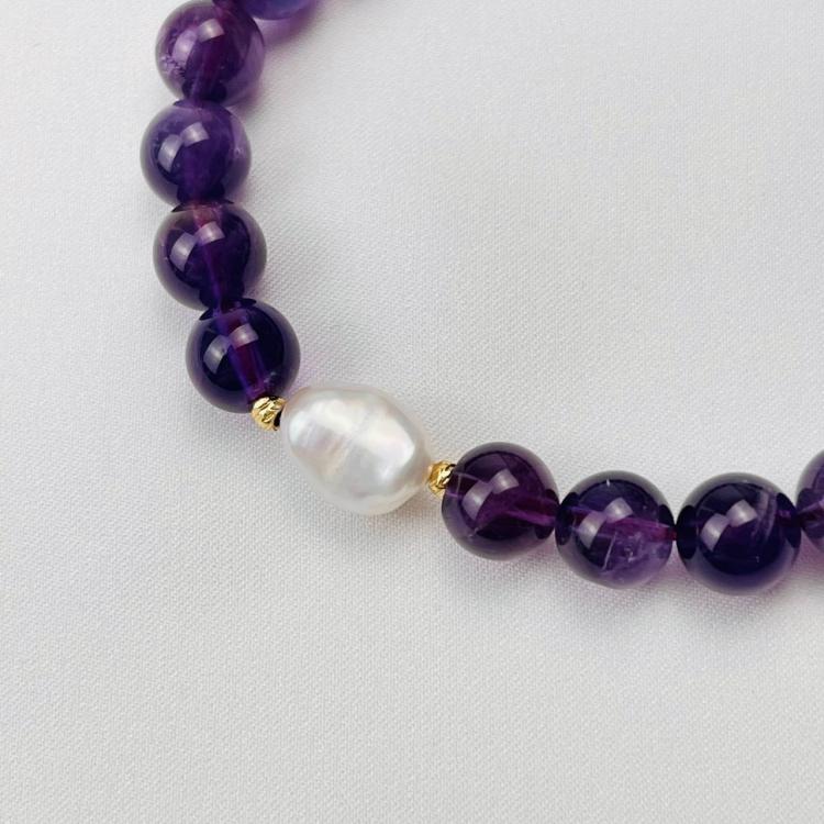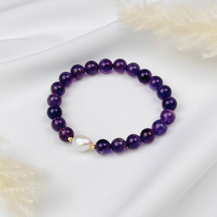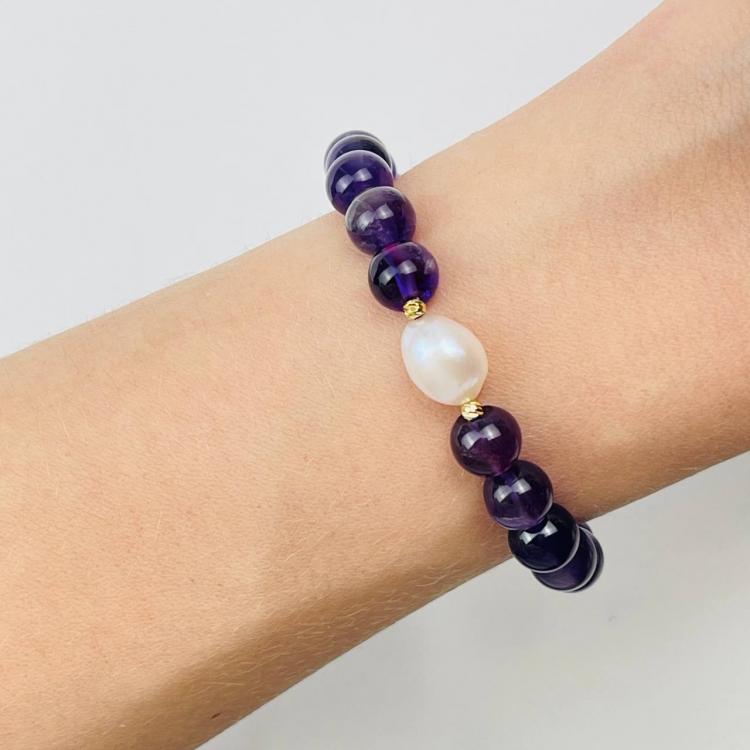 Браслет из Аметиста и Жемчуга, 17 см – 19 см, 8 мм, Бразилия