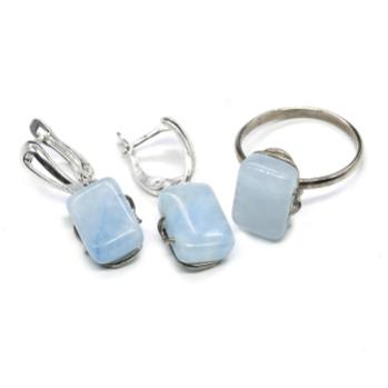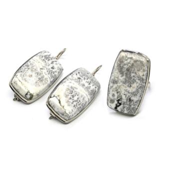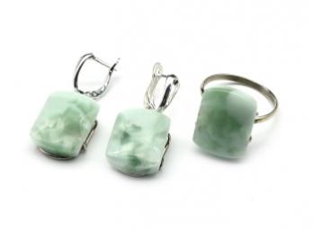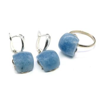 Авторское украшение ручной работы. Камни установлены в оправу из ювелирного сплава - нейзильбер. Габарит кольца 16*35мм, серьги 14*38мм. Указанный размер кольца можно отрегулировать + - 1 размер, при помощи сжатия или разжатия специального элемента, который находится с тыльной стороны оправы. Элемент регулировки выглядит в виде вытянутого овала. При сжатии элемента размер кольца уменьшается. При разжатии размер кольца увеличивается. Сделать регулировку можно домашним инструментом.