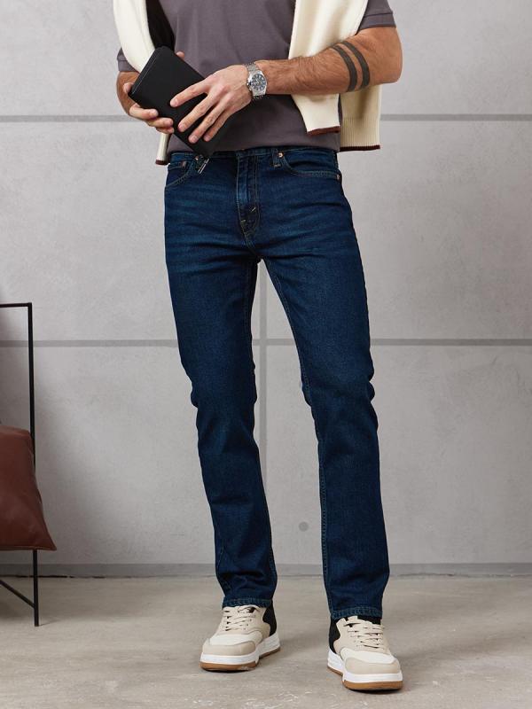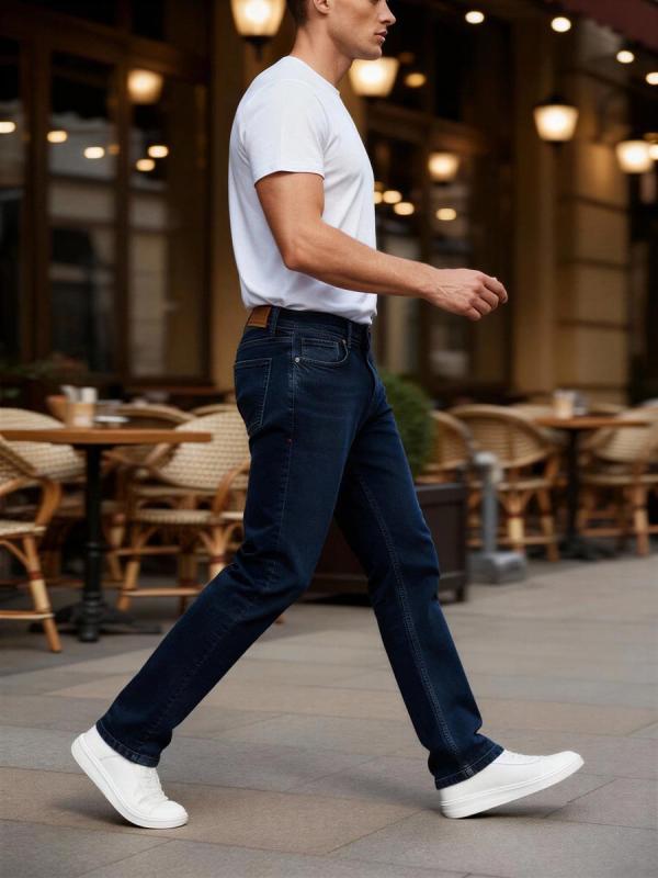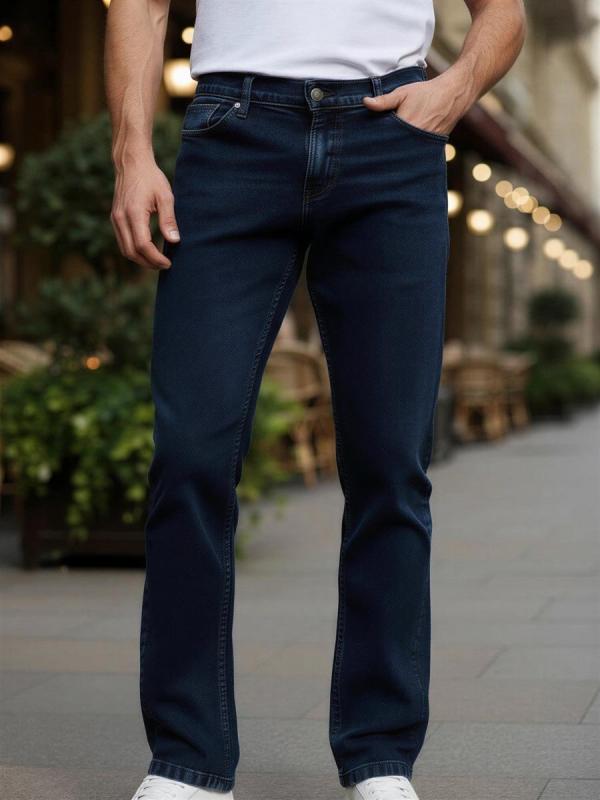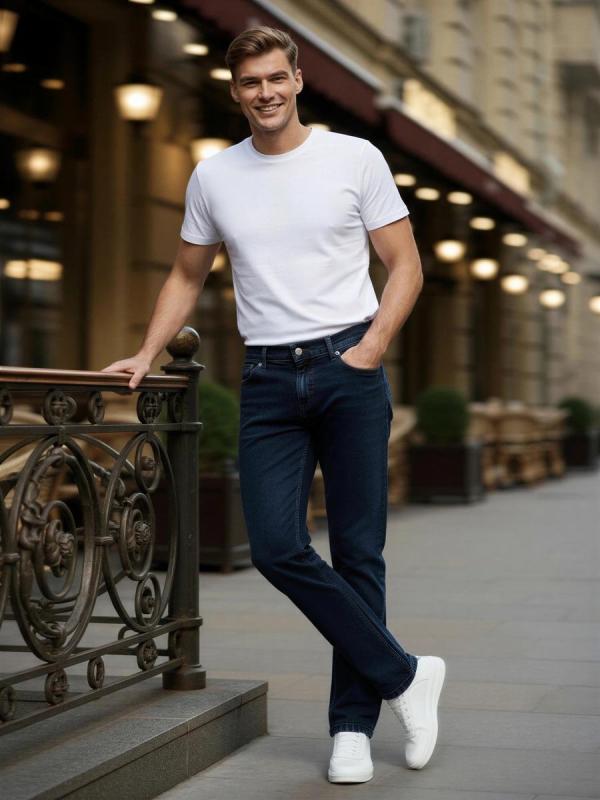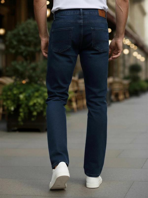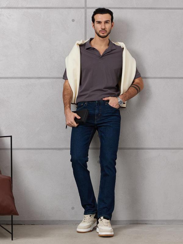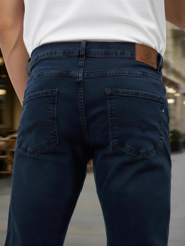 Мужские классические джинсы с пятью карманами. Посадка Slim fit (облегающие по бедру), средняя высота талии. Застежка на молнии. Немного зауженные к низу. Выполнены из эластичной ткани denim stretch, цвет ткани Blue-Black(лицевая сторона ткани темно-синяя, изнаночная сторона- черная). Темная стирка "