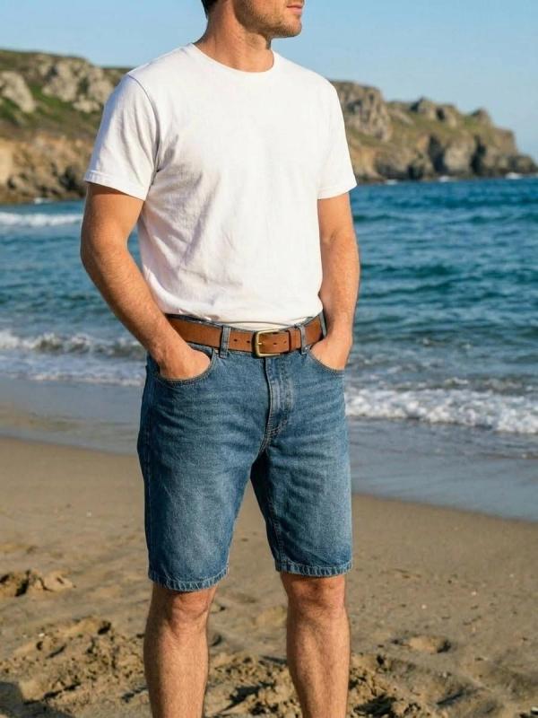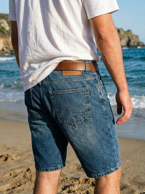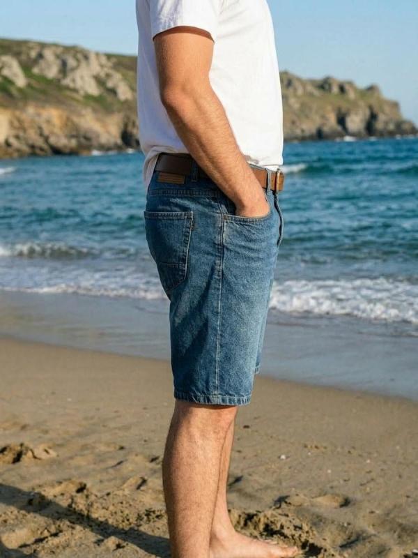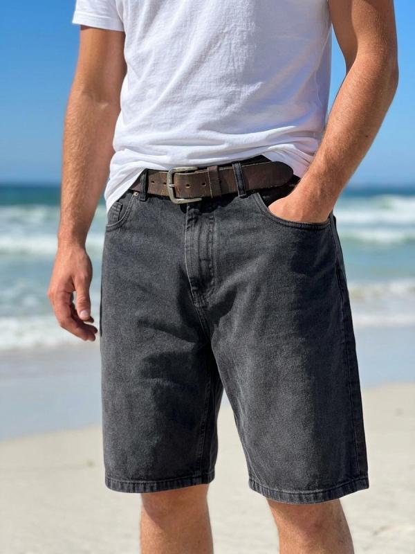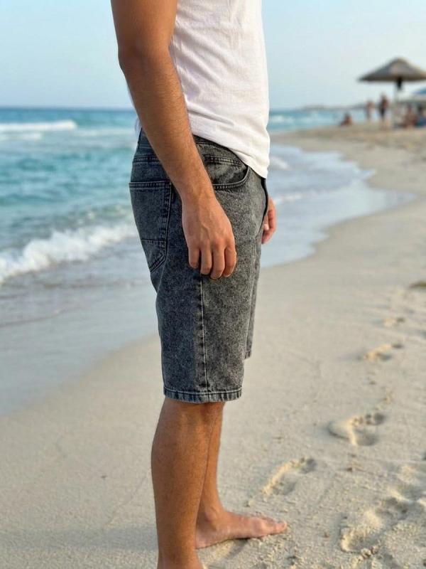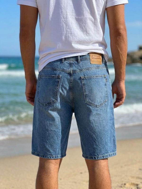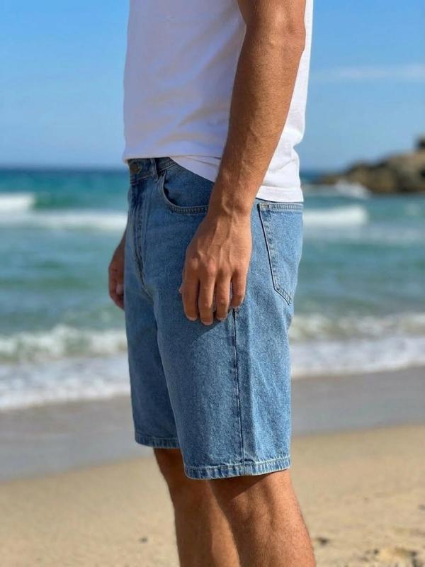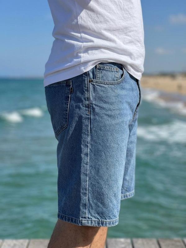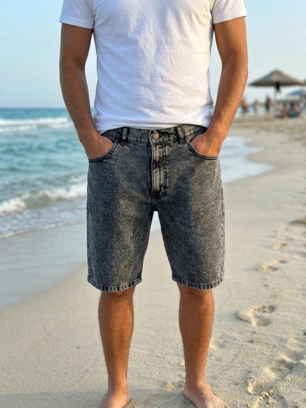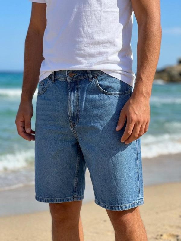 Мужские джинсовые шорты с пятью карманами. Посадка Comfort fit (свободные по бедру), Высокая талия спереди и сзади.Застежка на молнии. Изготовлены из традиционного хлопкового денима. Средняя стирка с потёртостями и "