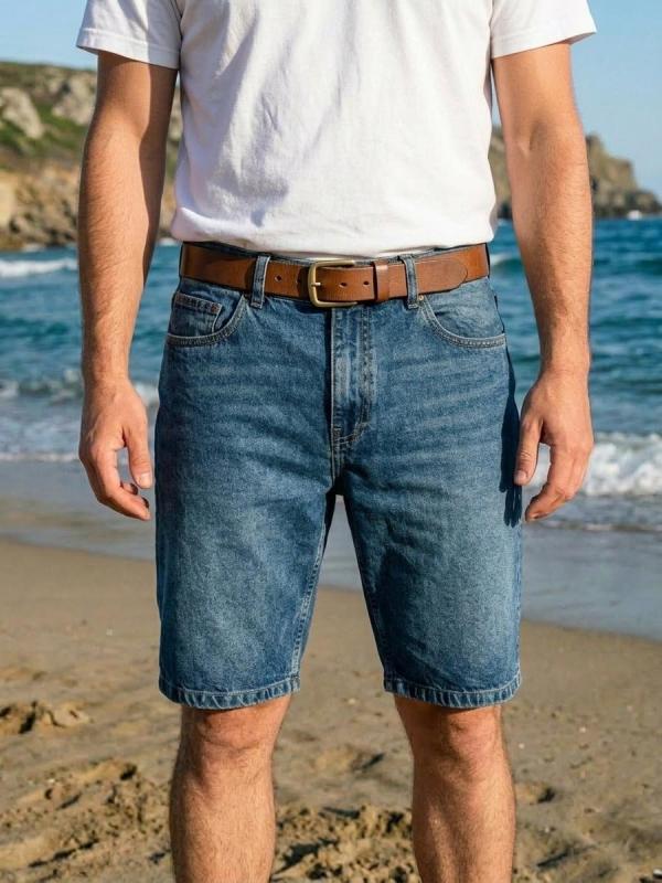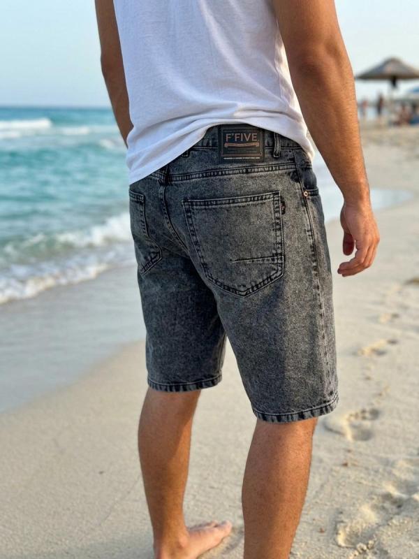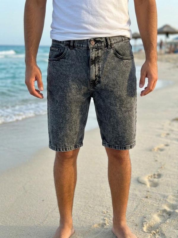 Мужские джинсовые шорты с пятью карманами. Посадка Regular fit (полуоблегающие по бедру), Высокая талия спереди и сзади.Застежка на молнии. Изготовлены из традиционного хлопкового денима. Средняя стирка с потёртостями и "