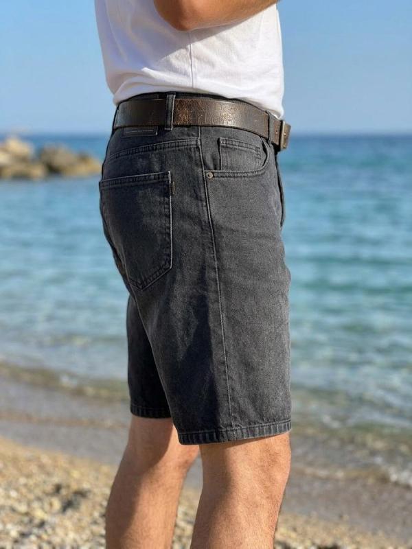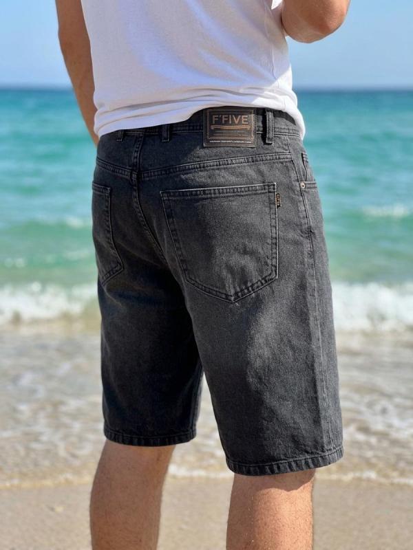 Мужские джинсовые шорты с пятью карманами. Посадка Regular fit (полуоблегающие по бедру), Высокая талия спереди и сзади.Застежка на молнии. Изготовлены из черного хлопкового денима, цвет ткани Black-Black (лицевая и изнаночная стороны ткани черные).Специальная средняя стирка с "