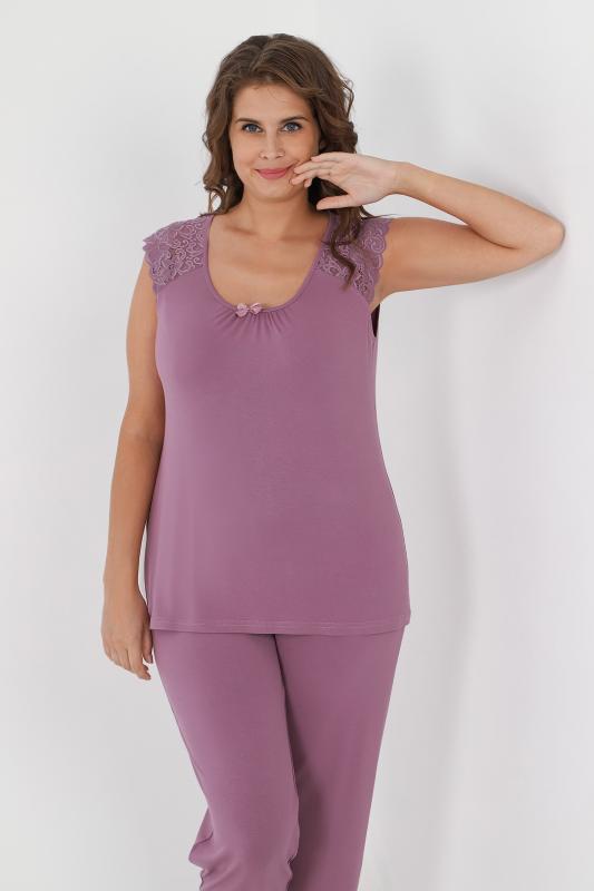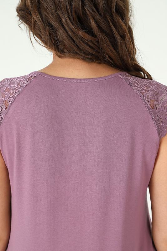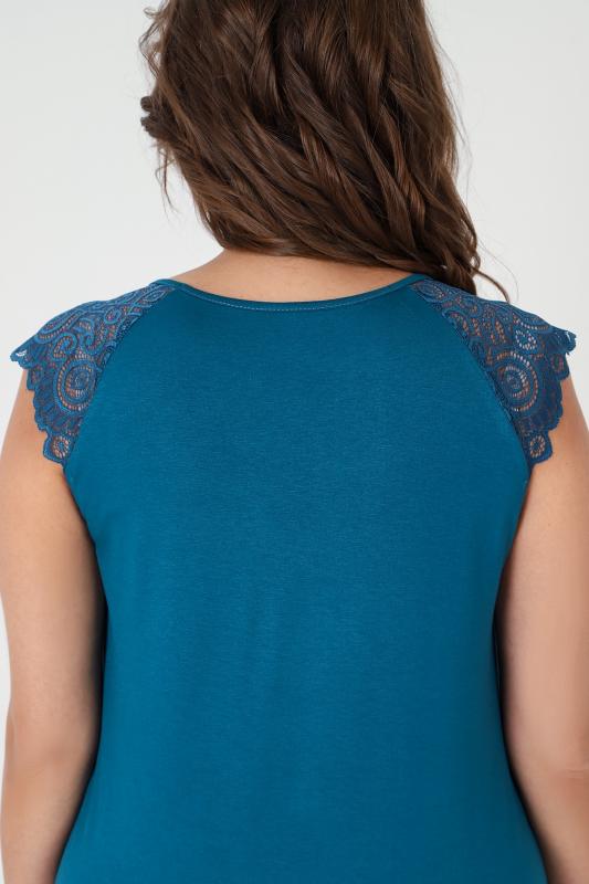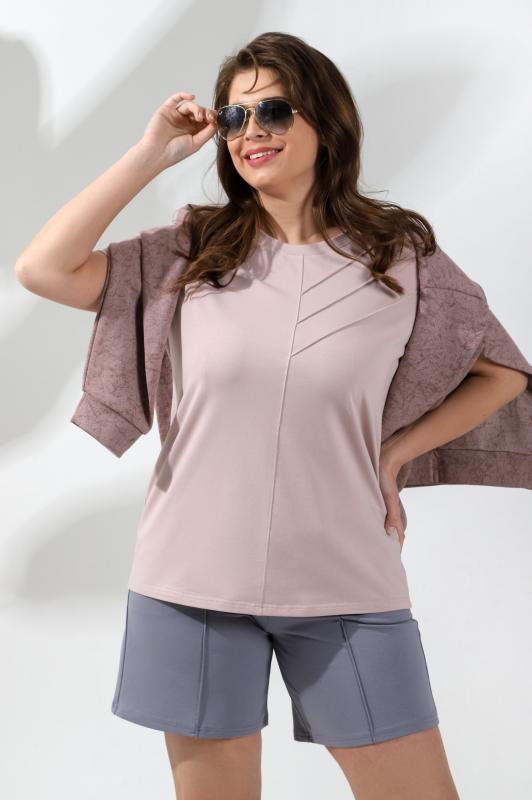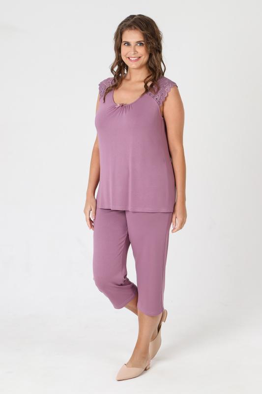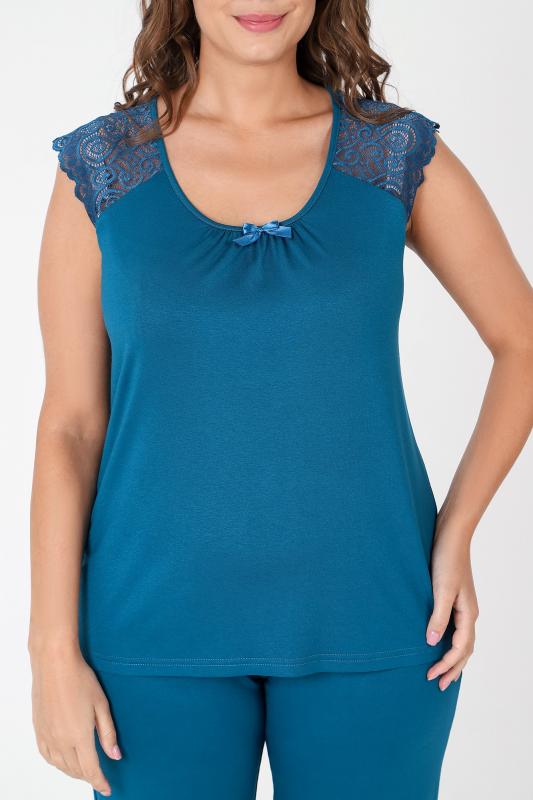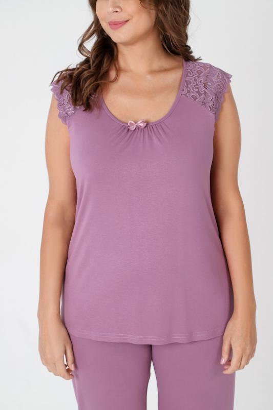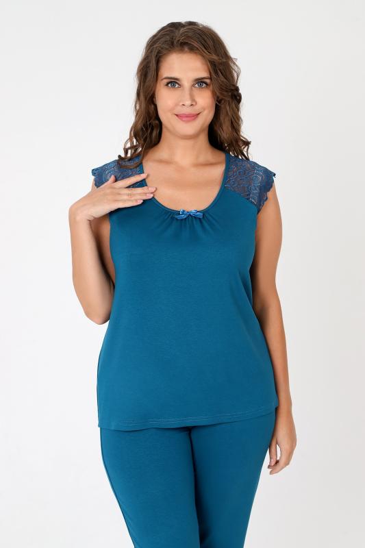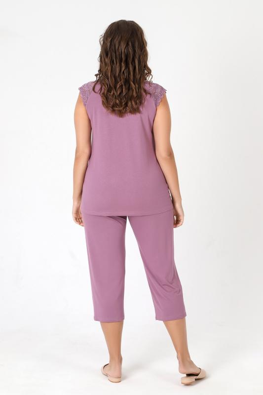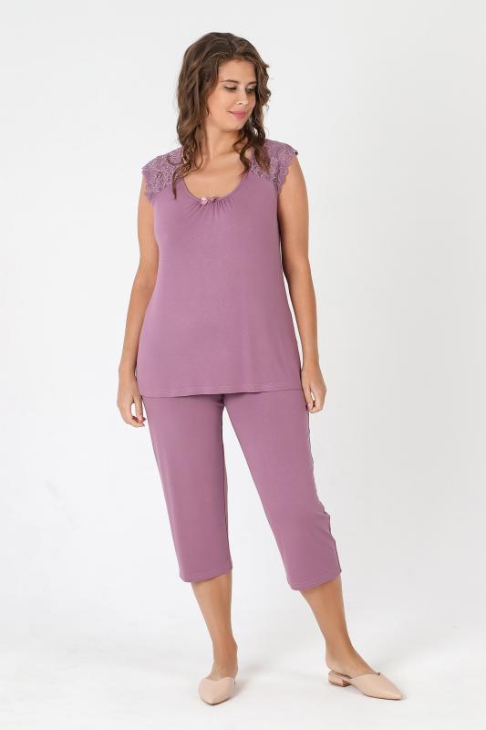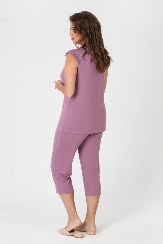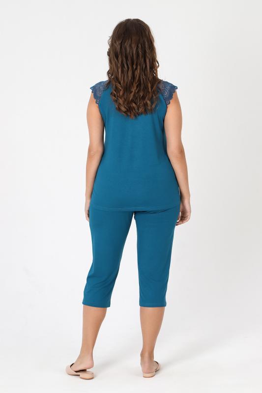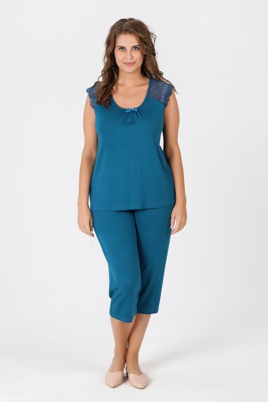 Пижама - женская из трикотажного гладкокрашенного вискозного полотна, состоящая из футболки и бридж. Футболка - слегка расширенная книзу, с короткими кружевными рукавами покроя «реглан» и горловиной овальной формы, окантованной основным материалом. По срезу горловины выполнена небольшая сборка, по центру декоративный бантик из узкой атласной ленты.Бриджи – свободного покроя, с эластичной тесьмой по талии.
